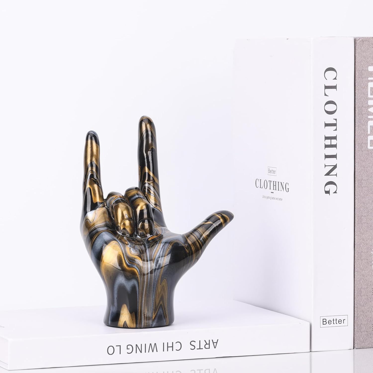 • Rock-and-Roll-inspirierte Dekoration: Verleihen Sie Ihrem Raum einen Hauch von rebellischem Geist mit der Rock-and-Roll-Handzeichen-Statue. Dieses einzigartige und kantige Stück fängt die Essenz der Rockmusik mit seiner ikonischen Handgeste ein. Egal,
