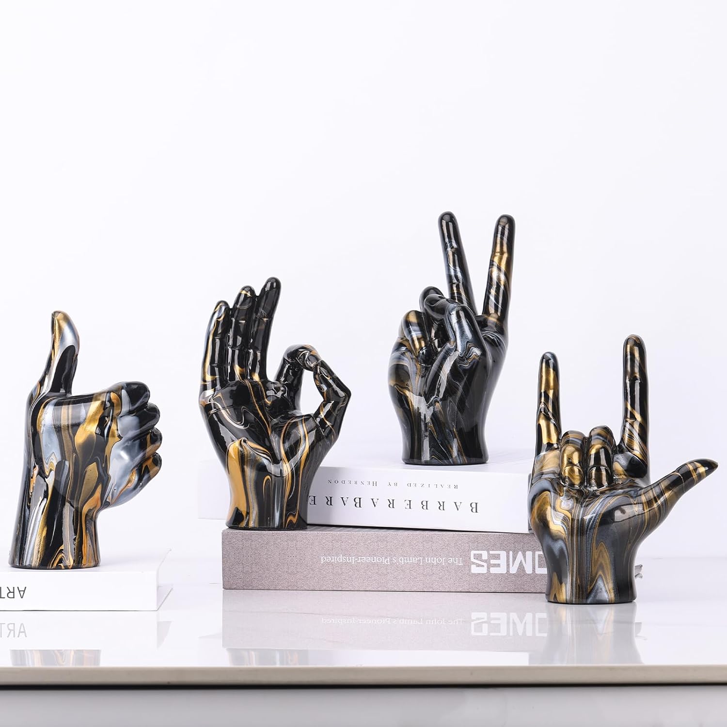 • Friedenszeichen-Dekor: Umfassen Sie die Botschaft des Friedens und der Harmonie mit diesem Friedenszeichen-Dekor. Die ikonische Friedenshand-Statue verleiht Ihrem Raum eine ruhige und beruhigende Note. Es ist ein perfekter Akzent für Meditationsräume,