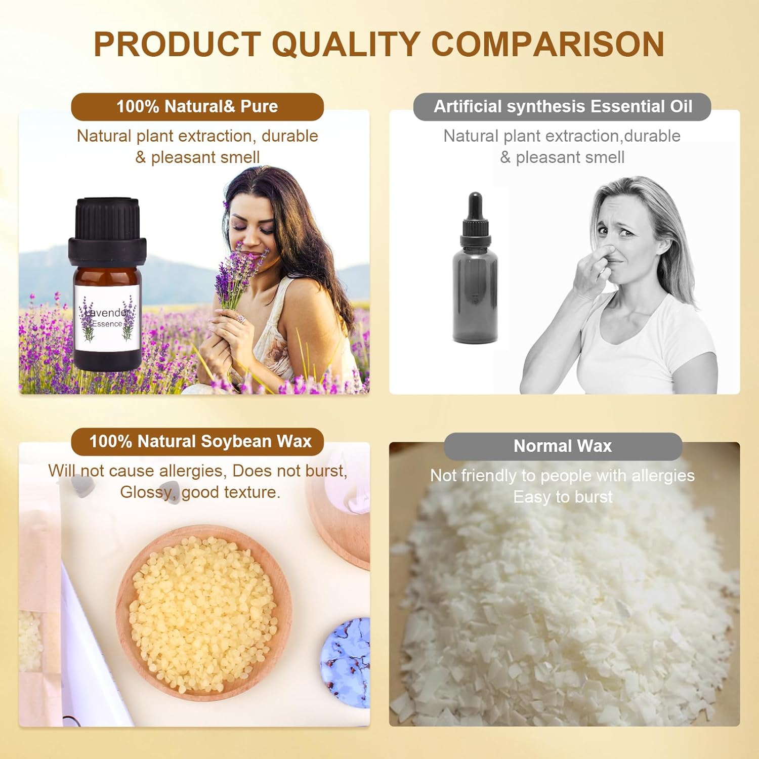 - 【DIY Your Duftkerze】-Unsere Kerzenherstellungssets sind in 9 zarten Kerzengläsern, 6 Fläschchen Aromatisieren in den Duftnoten Lemongrass,Mint,Orange,Lavender,Eucalyptus und Tea Tree und 4 feste Farbstoffe in den Farben Rot, Gelb, Lila und Blau.