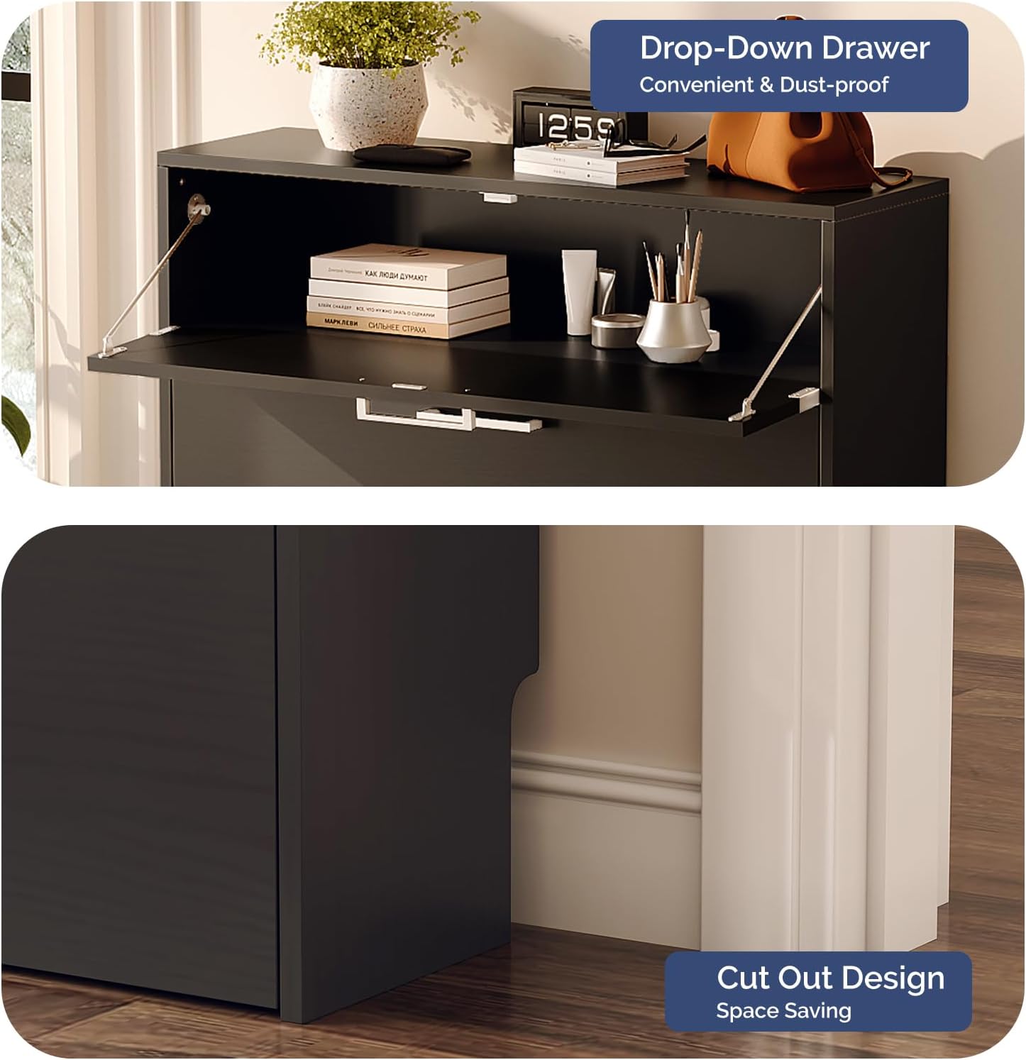 - 📦 【Optimale Raumnutzung】 Die Ablagefläche eignet sich ideal für Bilderrahmen oder Vasen, während die versteckte Klappschublade Kleinteile wie Karten, Schlüssel und Schuhpflegemittel ordentlich verstaut. Zwei platzsparende Klapptüren