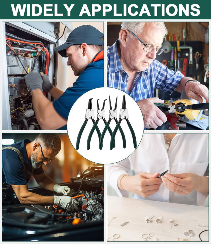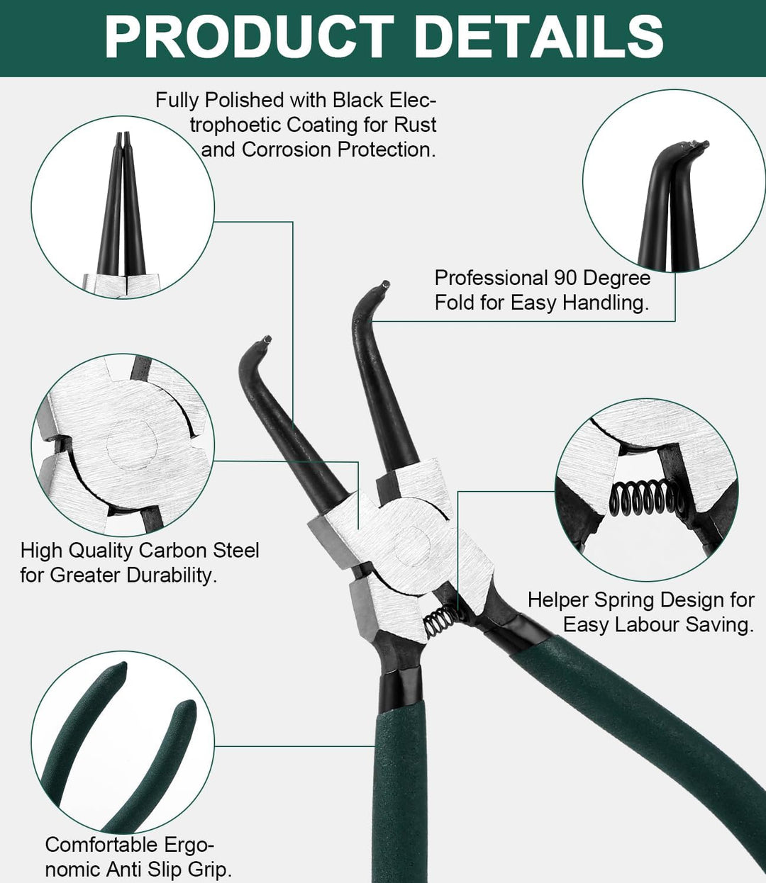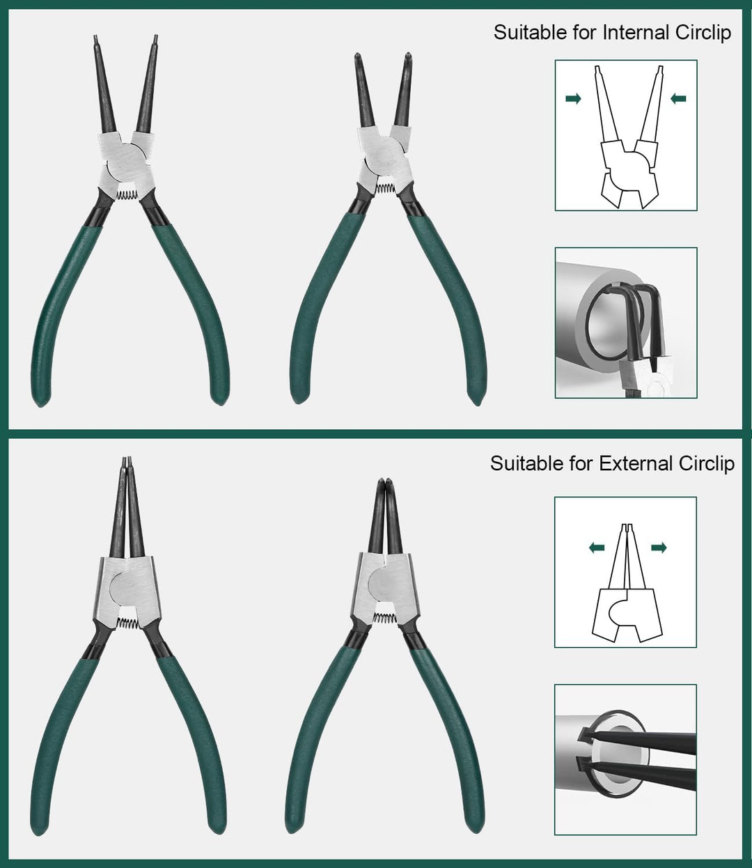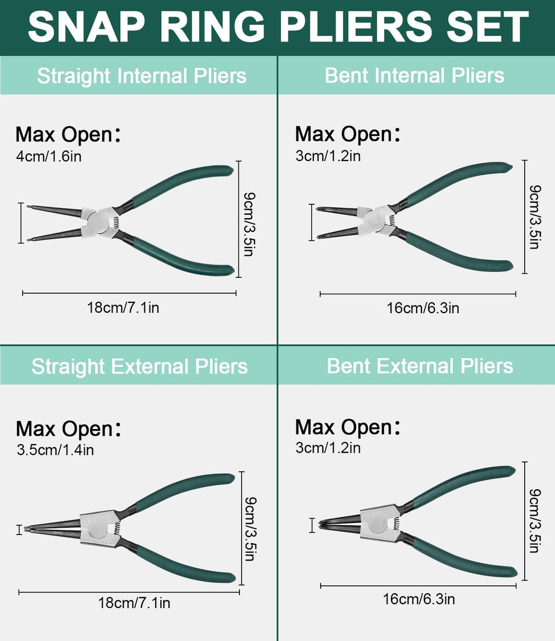 - 4 Stück Sprengringzangen Set: Der 4-teilige Seegeringzange von Klemmzangen umfasst zwei Grössen von geraden und gebogenen Sicherungsringzange für Arbeiten im Innen- und Aussenbereich. Alle Zangen haben einen Spitzendurchmesser von 1,6 mm, um