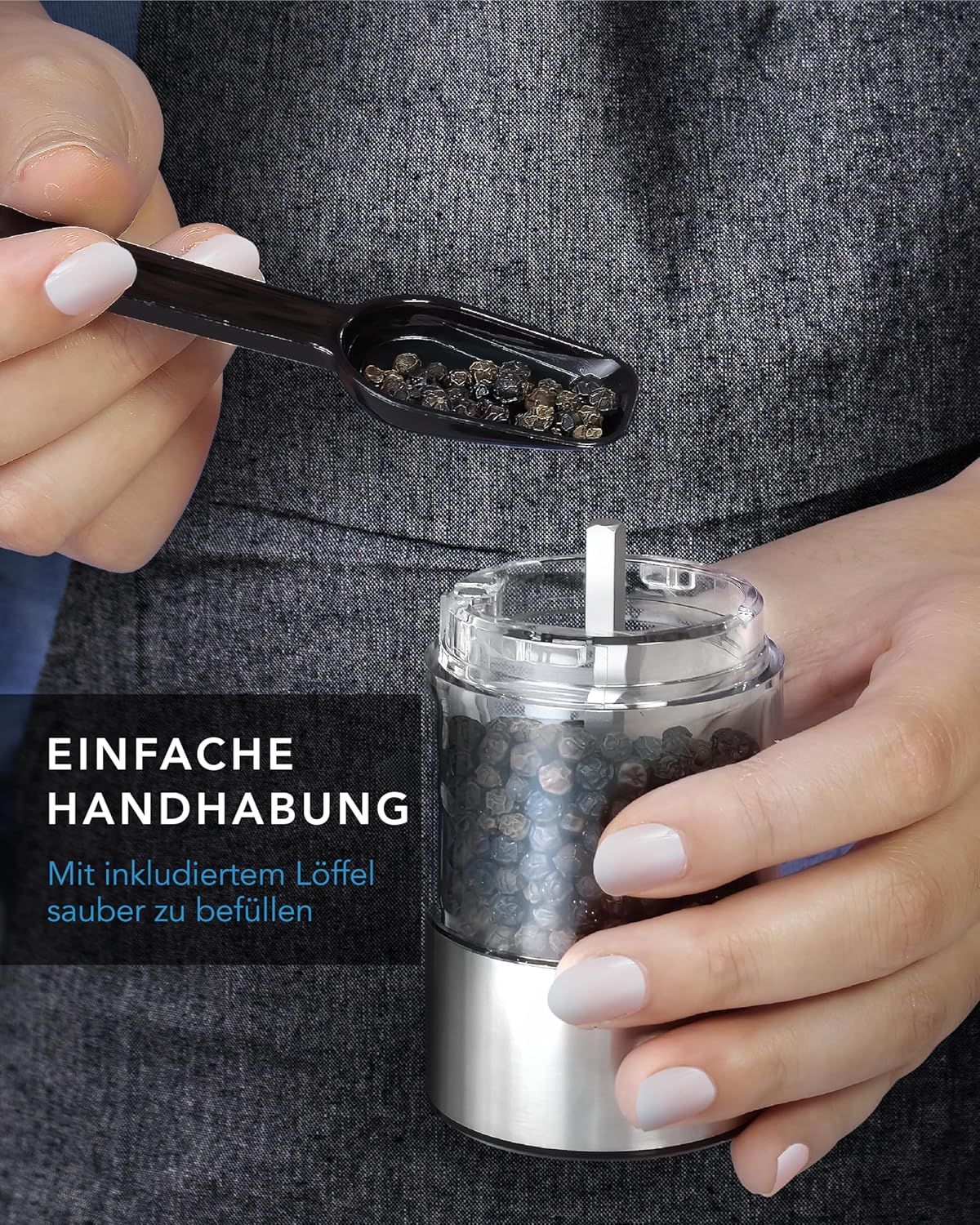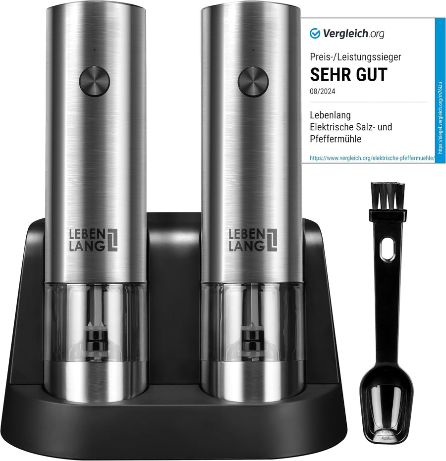 - 📦 UMFANGREICHES SET : LEBENLANG Elektrischer Salz und Pfefferstreuer elektrisch inklusive trennbarer Basisstation für die leichte Reinigung, USB-C Kabel & Reinigungspinsel + Einfüll-Löffel, sodass Sie sofort mit der Befüllung und Nutzung Ihres