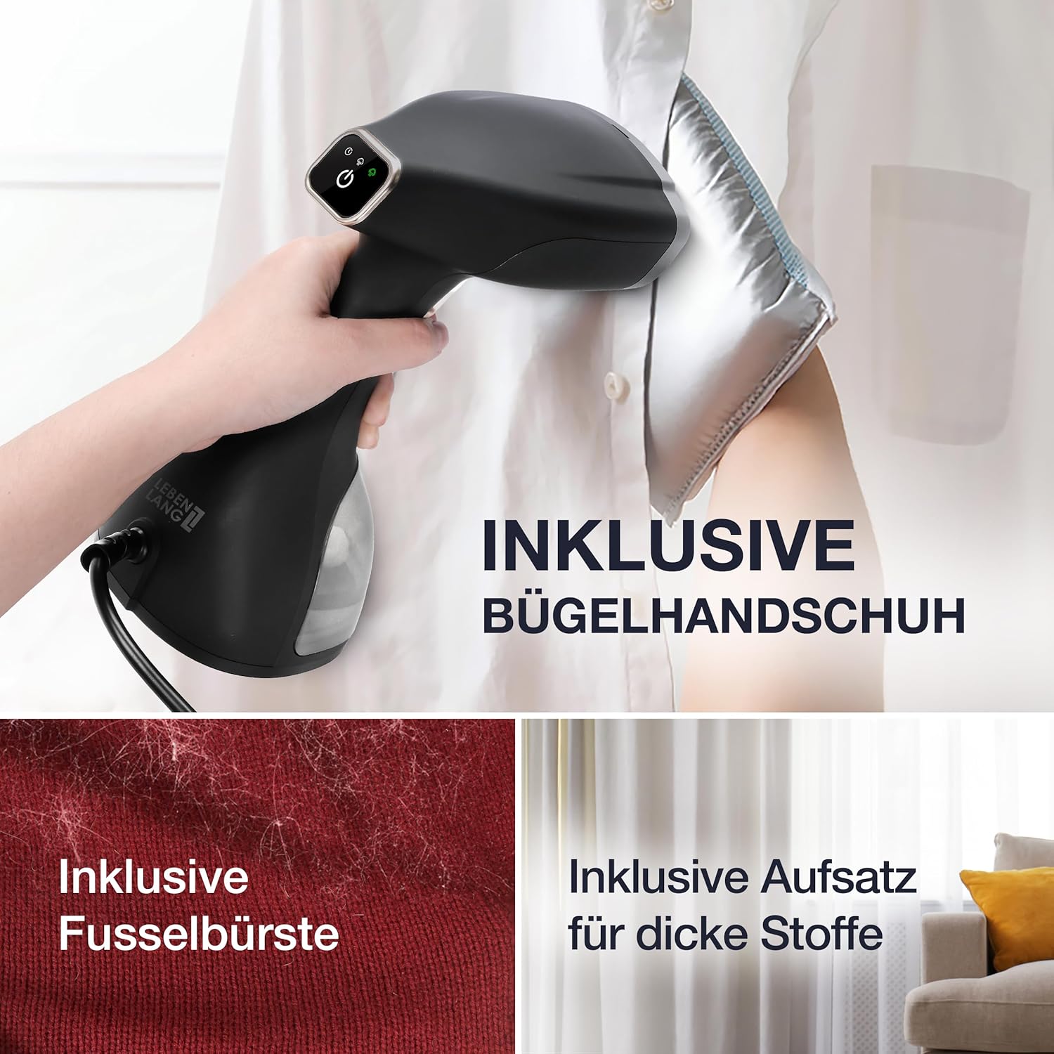 - 👔 𝐋𝐄𝐁𝐄𝐍𝐋𝐀𝐍𝐆 – Deluxe Dampfbügler in satin schwarz matt mit Gold Akzenten – Schnell einfach auf dem Kleiderbügel glätten und Zeit sparen - ohne lästiges Bügelbrett auf- und abbauen - mit extra langem 2,5 Meter Kabel
