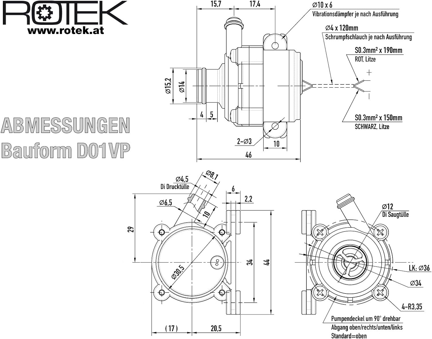 • Max. Förderhöhe 1,0mWs (0,1bar) bei 0 l/min Fördermenge (Stromaufnahme 300mA)