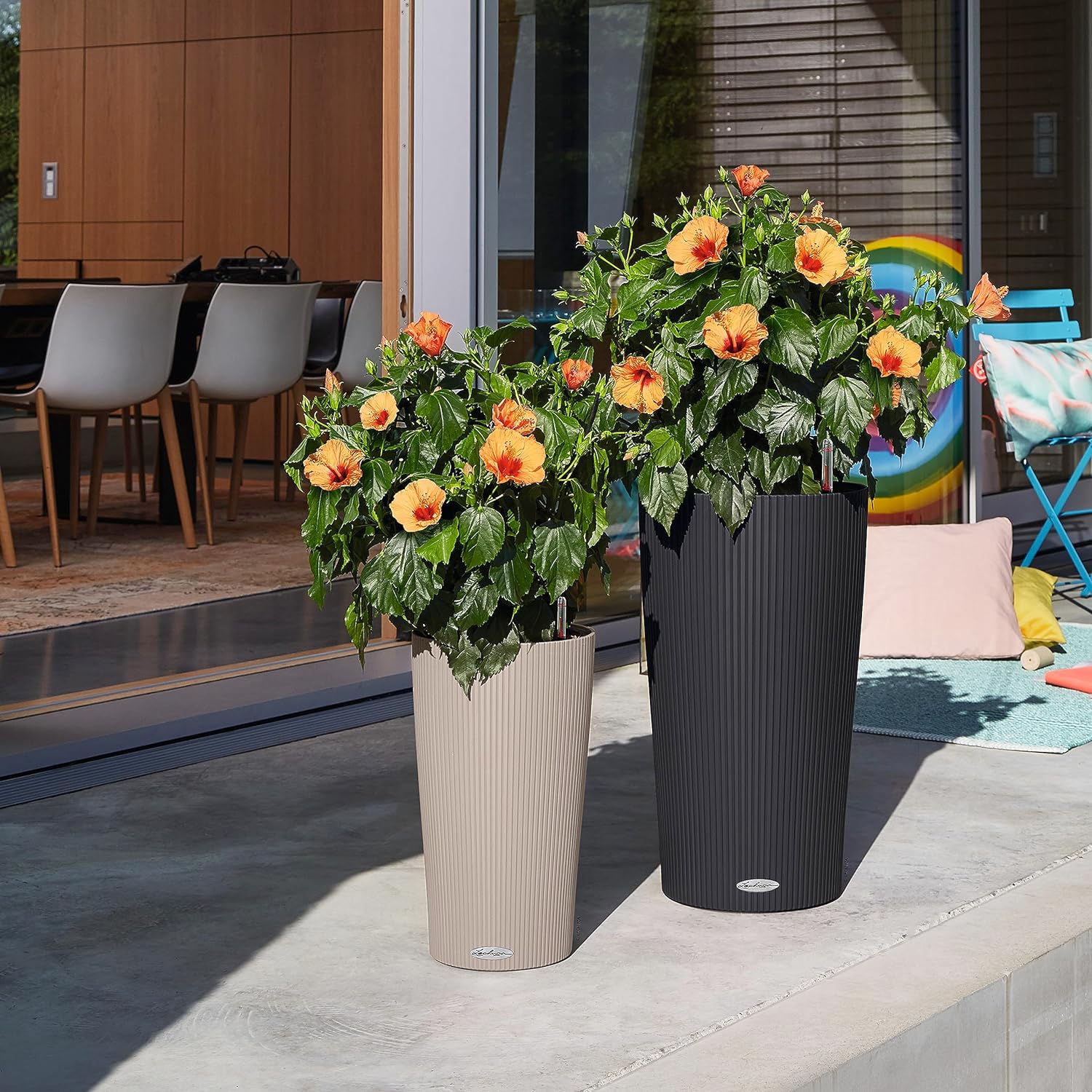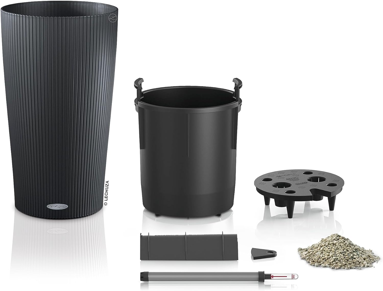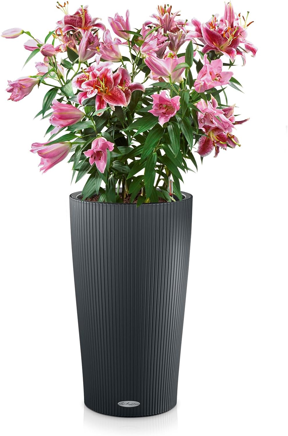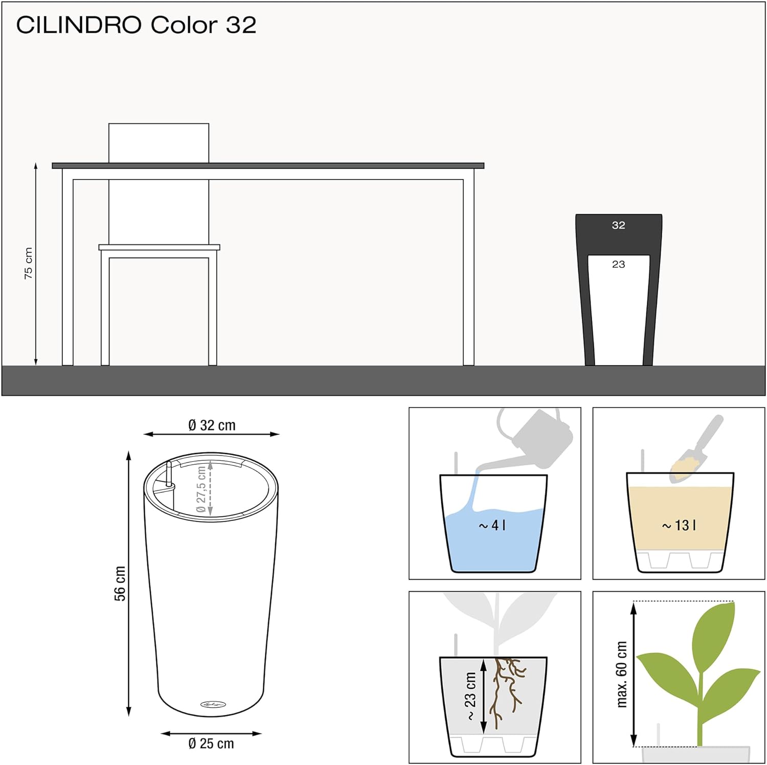 - ALL-IN-ONE: 1x Pflanzgefäss CILINDRO Color, inkl. Bewässerungssystem, Pflanzsubstrat LECHUZA-PON als Drainageschicht und wechselbarem Pflanzeinsatz mit versenkbaren Griffen und Wasserstandsanzeiger. Material: Kunststoff Masse: 32x32x56 cm