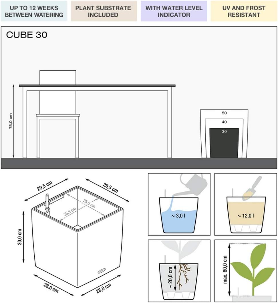 • ALL-IN-ONE: 1x Pflanzgefäss CUBE Premium, inkl. Bewässerungssystem, Pflanzsubstrat LECHUZA-PON als Drainageschicht und wechselbarem Pflanzeinsatz mit versenkbaren Griffen und Wasserstandsanzeiger. Material: Kunststoff Masse: 29,5 x 29,5 x 30 cm