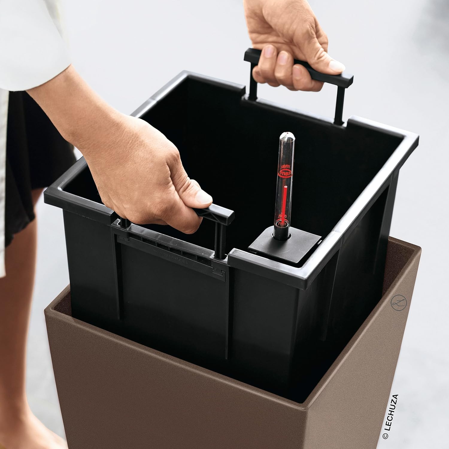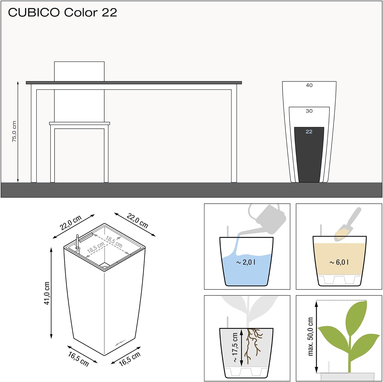 - ALL-IN-ONE: 1x Pflanzgefäss CUBICO Color, inkl. Bewässerungssystem, Pflanzsubstrat LECHUZA-PON als Drainageschicht und wechselbarer Pflanzeinsatz mit versenkbaren Griffen und Wasserstandsanzeiger. Material: Kunststoff Masse: 22 x 22 x 41 cm