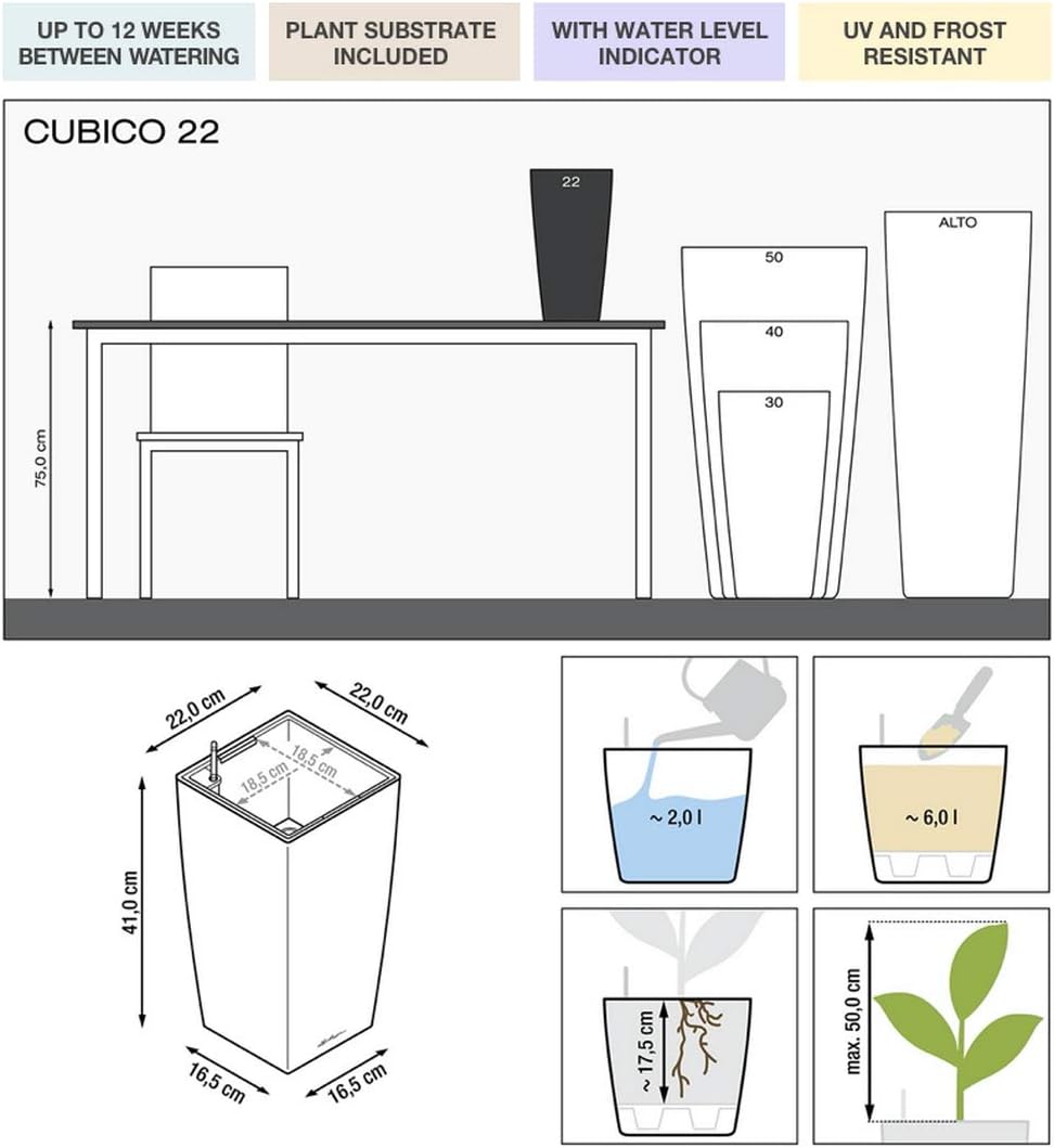 - Lieferumfang: 1x LECHUZA CUBICO Premium 22, Inkl. Bewässerungssystem, Material: Kunststoff, Masse: 22 x 22 x 41 cm, Pflanzeinsatz: 18,5 x 18,5 cm, Pflanzvolumen: 6 l, Wasserspeicher: 2,0 l