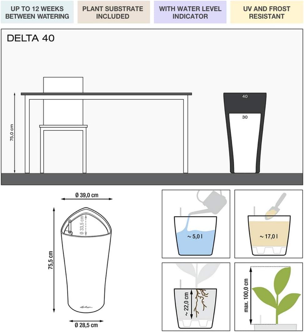 • ALL-IN-ONE: 1x Pflanzgefäss DELTAPremium, inkl. Bewässerungssystem, Pflanzsubstrat LECHUZA-PON als Drainageschicht und wechselbarem Pflanzeinsatz mit versenkbaren Griffen und Wasserstandsanzeiger. Material: Kunststoff Masse: 39 x 75,5 cm