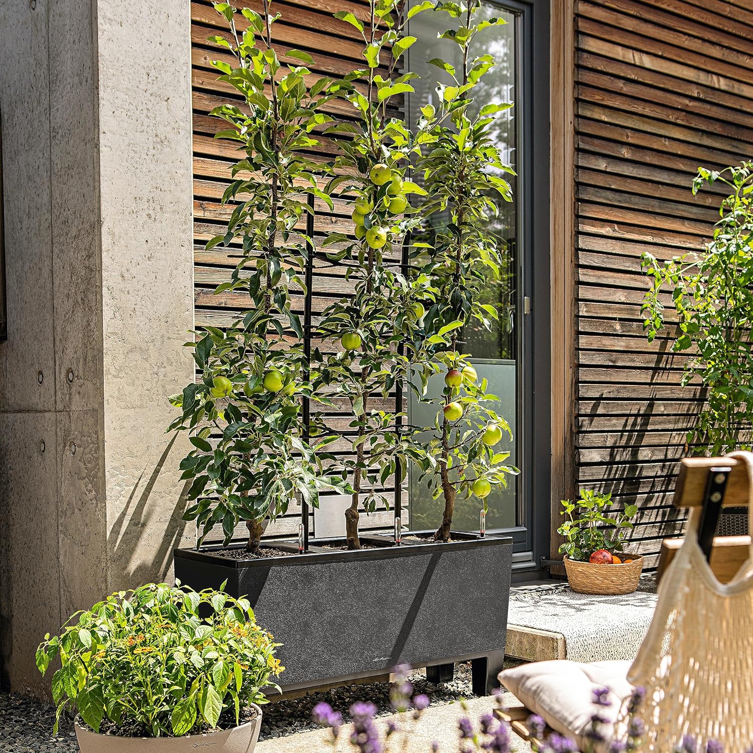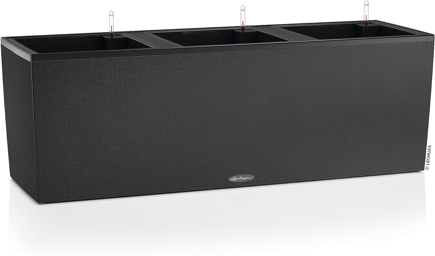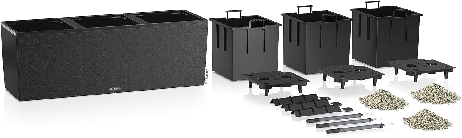 - ALL-IN-ONE: 1x Pflanzgefäss TRIO Stone, inkl. Bewässerungssystem, Pflanzsubstrat LECHUZA-PON als Drainageschicht und 3 wechselbaren Pflanzeinsätzen mit versenkbaren Griffen und Wasserstandsanzeiger. Material: Kunststoff Masse: 129,5 x 42 x 44 cm