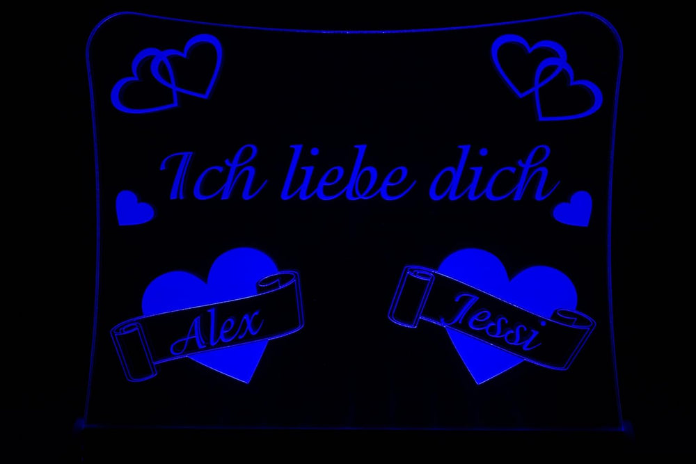 - Der romantische Tischaufsteller aus 6mm schlagfestem und stabilem Acryl Glas (GS), ist durchsichtig mit einer hochwertigen Lasergravur in Weiss und leuchtet dank energiesparenden LED´s in der ausgewählten Farbe