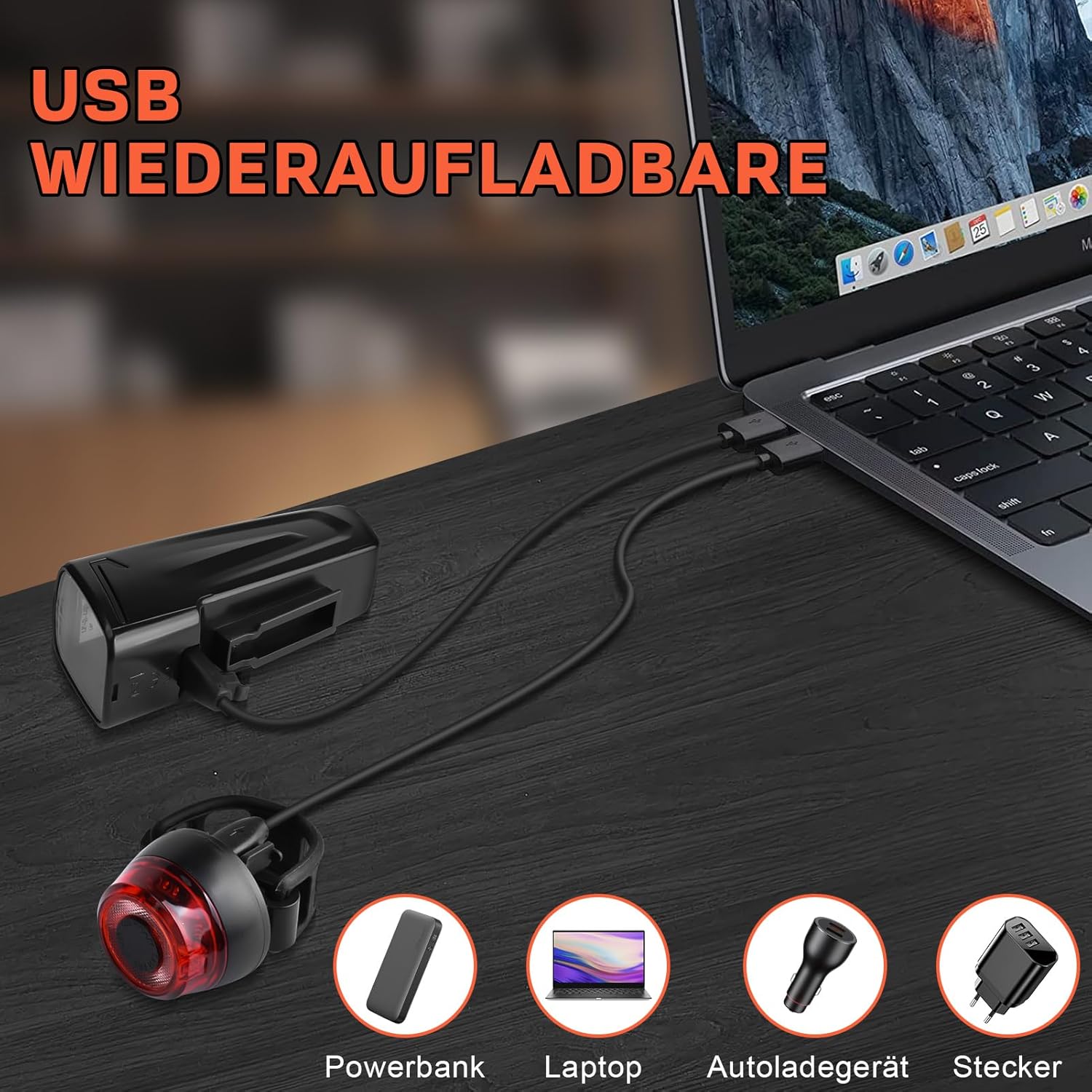 - 【Rücklicht Inklusiv】: Unser Fahrradrücklicht ist auch wiederaufladbar(Eingebaute 200mAh Batterie), hat nur 4 LUX, eine Ladezeit von 2 Stunden, aber eine Arbeitszeit von bis zu 4 Stunden. Nachts ist das auffällige rote Licht äusserst effektiv, um