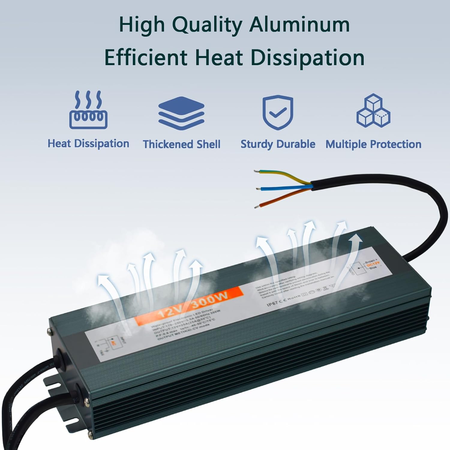 - 12V 300W LED Transformateur: Eingang: AC 170-250 V, 50/60 Hz, Ausgang: 12V, 25A, 300W. Konstanter Spannungsausgang, um die Stabilität der Stromversorgung zu gewährleisten. Es wird empfohlen, die Last auf nicht mehr als 85% ihrer maximalen Kapazität zu
