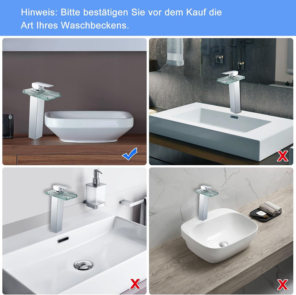 - 【Wasserfall Badarmatur】Dieser Wasserfall-Mischbatterie sorgt für einen weichen und sanften Wasserfluss, verhindert Spritzwasser und hält Ihr Waschbecken trocken. Passt auf Standardspüle, Sie benötigen einen Wasserdruck von 0,3 bis 0,5 MPa und