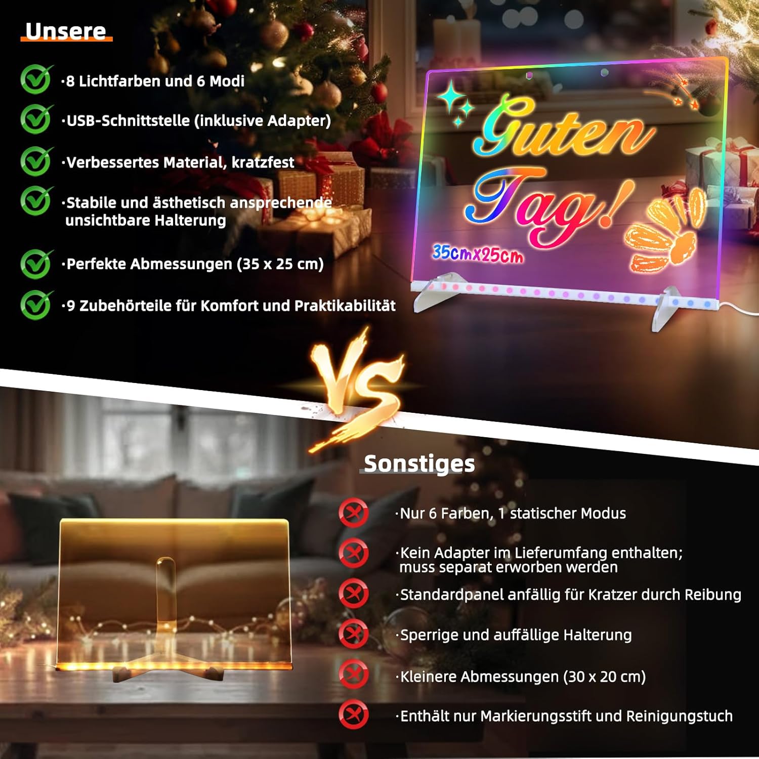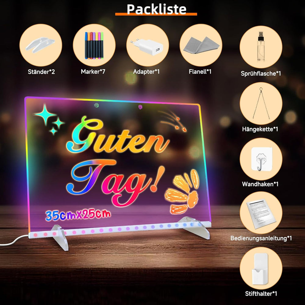 - 2025 Aufgerüstetes LED-Zeichenbrett: LED-Notiztafel mit Farben besteht aus hochwertigem, kratzfestem Acryl, das beim Abwischen nicht so leicht zerkratzt, reibungslos schreibt und leicht zu löschen ist.Die perfekte Grösse von 35x25cm bietet viel