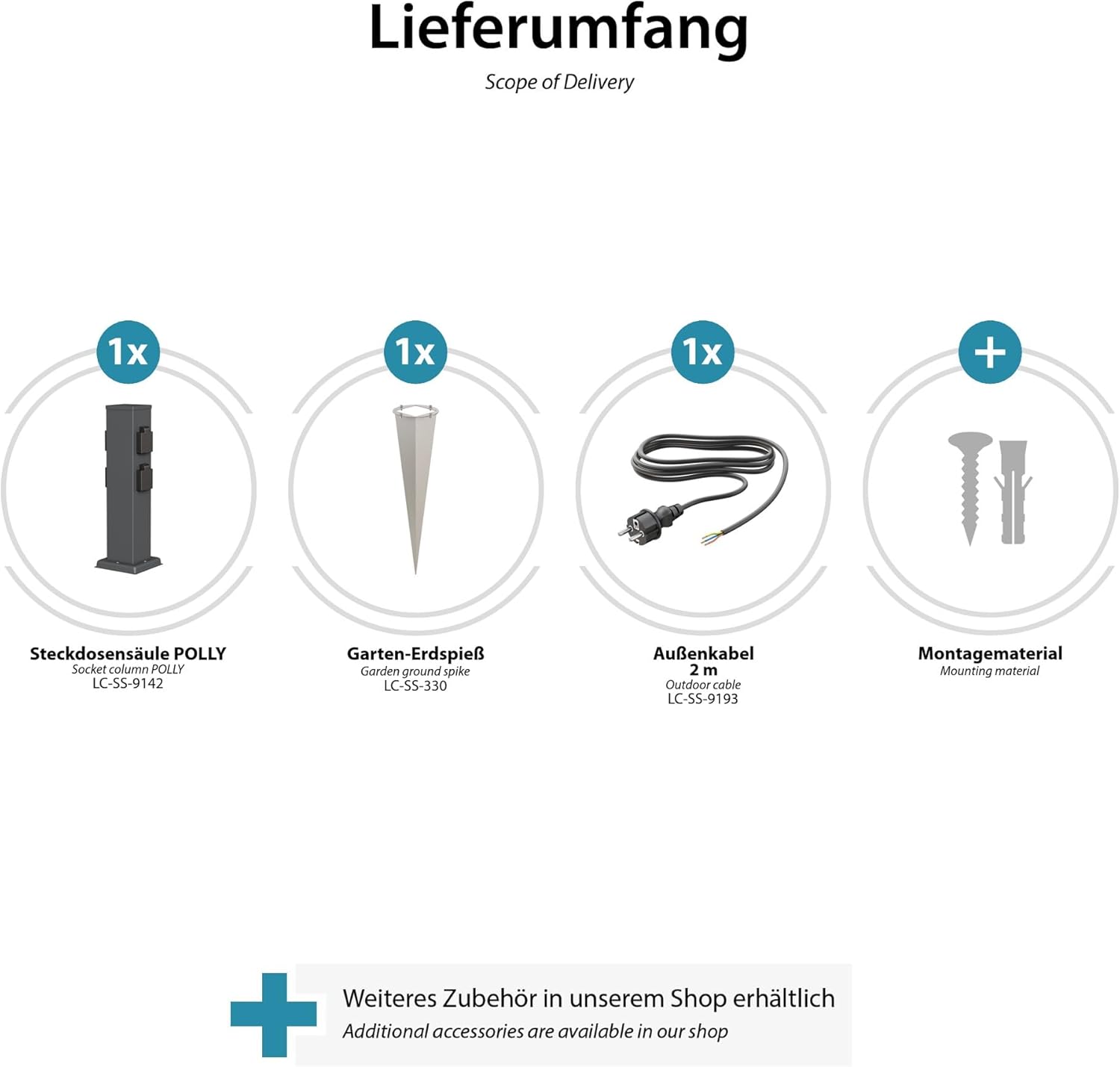 • [Anschluss erfolgt über 230 V Anschlussdose] - Der Anschluss der Energiesäule erfolgt über einen spritzwassergeschützten Kabelverbinder, der im Inneren der Aussensteckdose versenkt wird. Dadurch ist eine schnelle und sichere Installation der