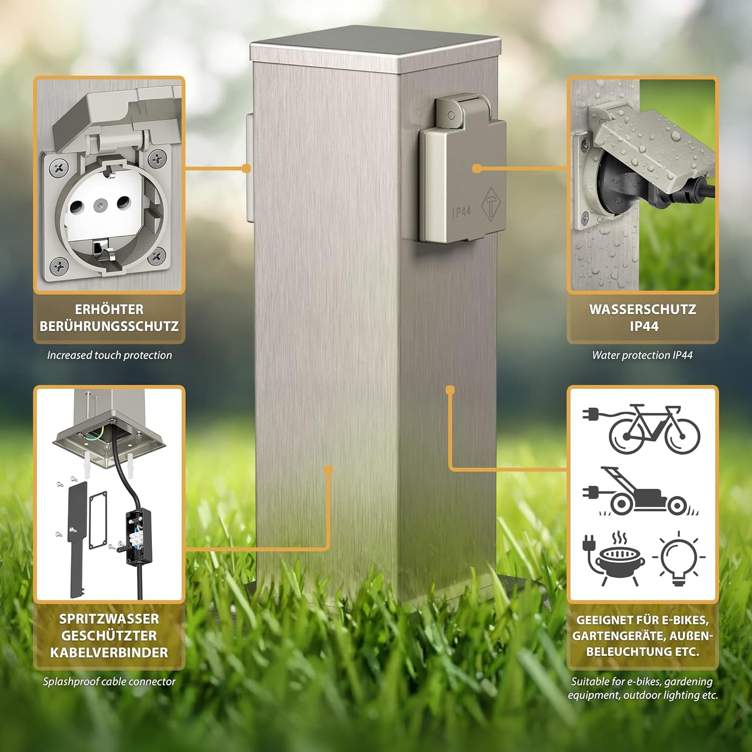 - [Kompakte Bauform] - Dank der kompakten Bauform (125 x 270 x 125 mm) lässt sich die Steckdosen-Säule problemlos auf dem Rasen oder der Terrasse befestigen. Das klassische Design aus hochwertigem Edelstahl fügt sich unauffällig in Ihren Aussenbereich