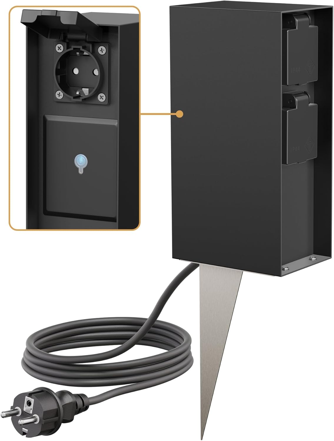 - [Kompakte, eckige Bauform] - Dank ihrer kompakten Abmessungen (85 x 230 x 120 mm) lässt sich die Steckdosen-Säule problemlos auf dem Rasen oder der Terrasse aufstellen. Mit ihrem minimalischen Design fügt sie sich stilvoll in jede Umgebung ein.