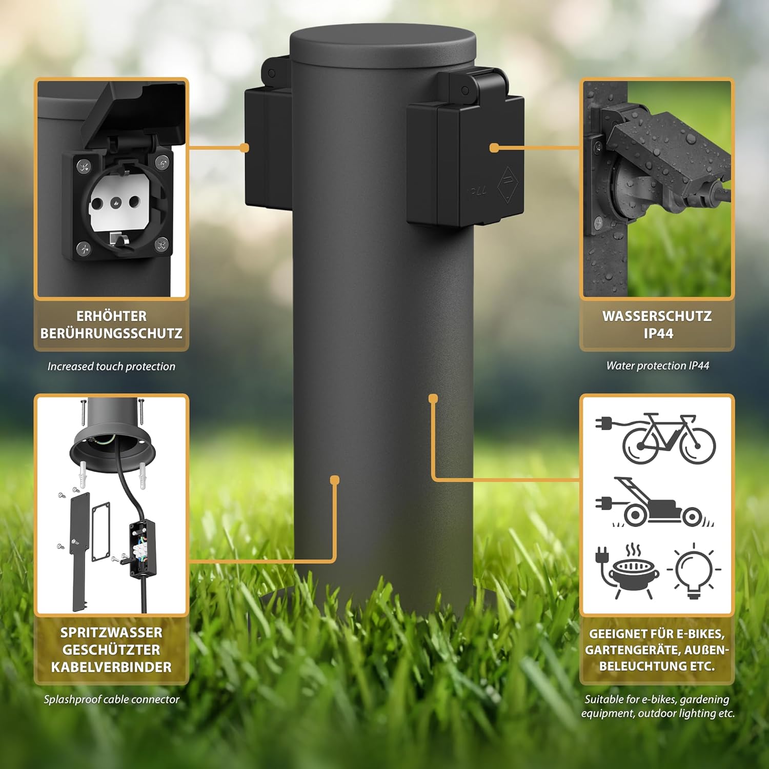 - [Stilvolle Stromverteilung im Garten] - Die Garten-Steckdosen-Säule verfügt über 2 Steckdosen mit Klappdeckeln und bietet eine ansprechende Möglichkeit zur praktischen Stromverteilung im Aussenbereich. Ob für den Betrieb einer Lichterkette, des