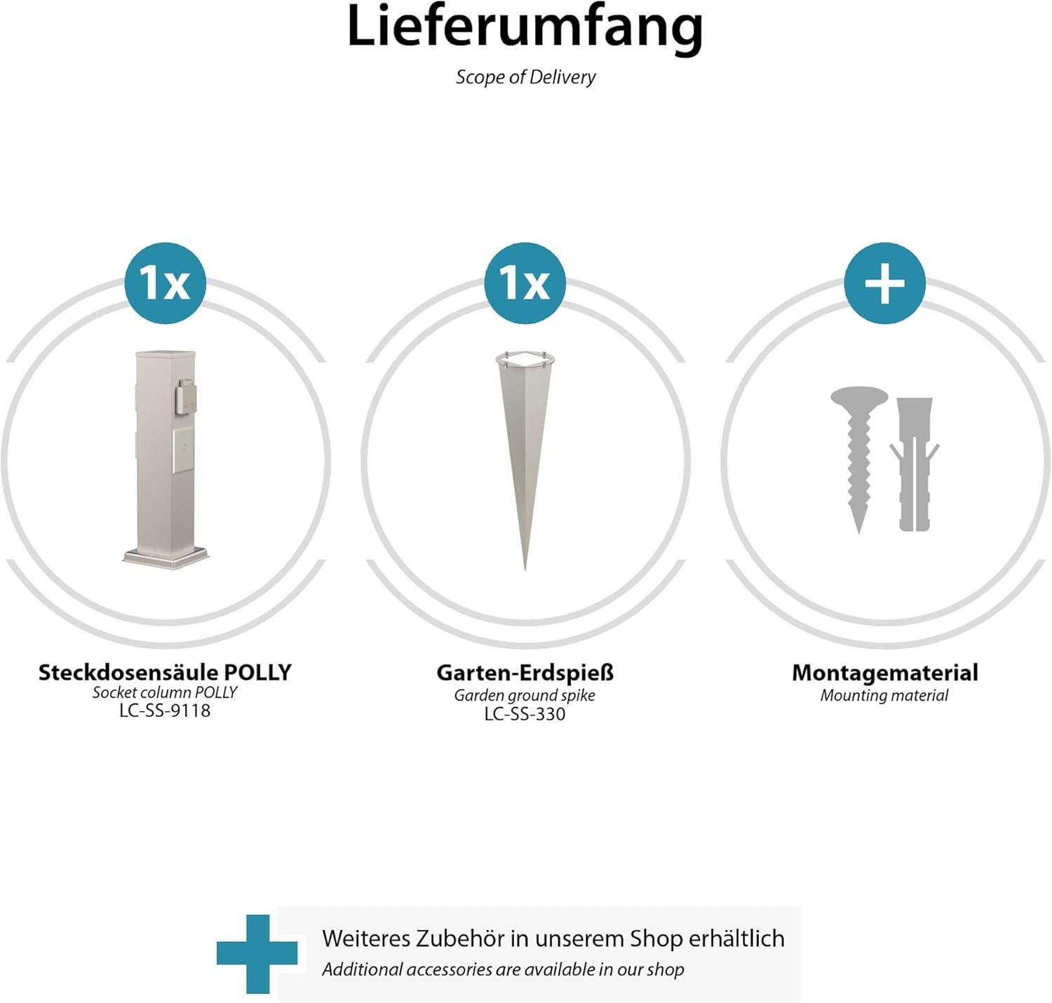 - [Schutzart IP44] - Die Steckdosensäule POLLY ist speziell für den Einsatz im Freien konzipiert. Das robuste Edelstahlgehäuse sichert die Gartensteckdose vor Spritzwasser und sorgt so für optimalen Schutz vor den Wettereinflüssen der verschiedenen