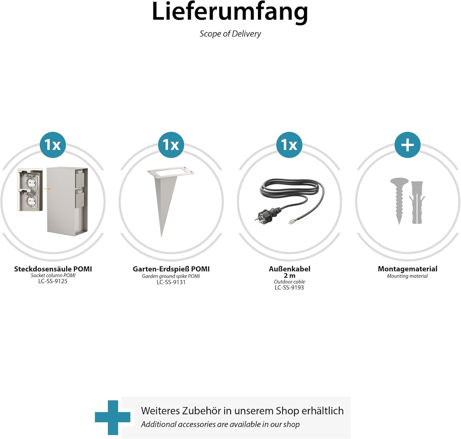 - [Anschluss über 230 V Kabelverbinder] - Der Anschluss der Energiesäule erfolgt über einen spritzwassergeschützten Kabelverbinder, der im Inneren der Aussensteckdose versenkt wird. Dadurch ist eine schnelle und wassergeschützte Installation der