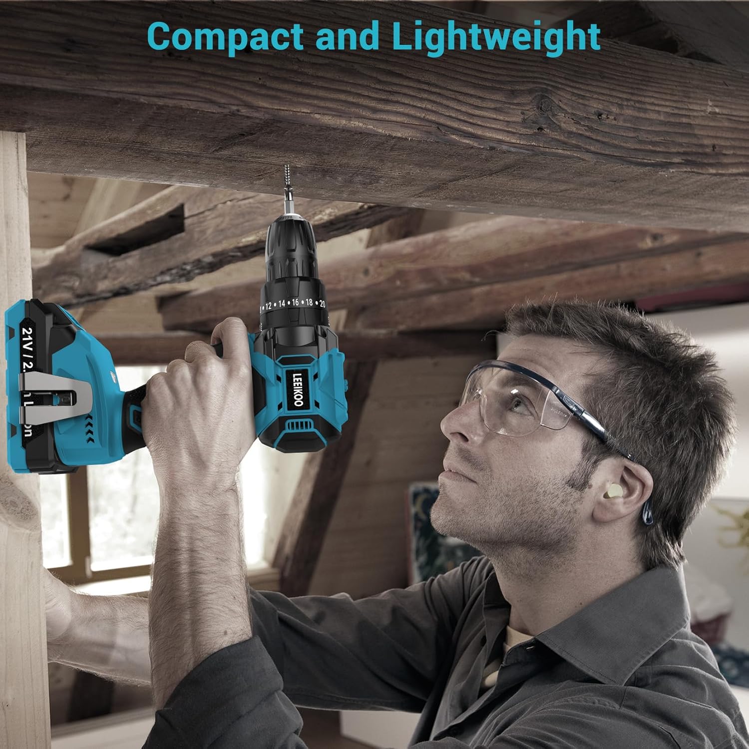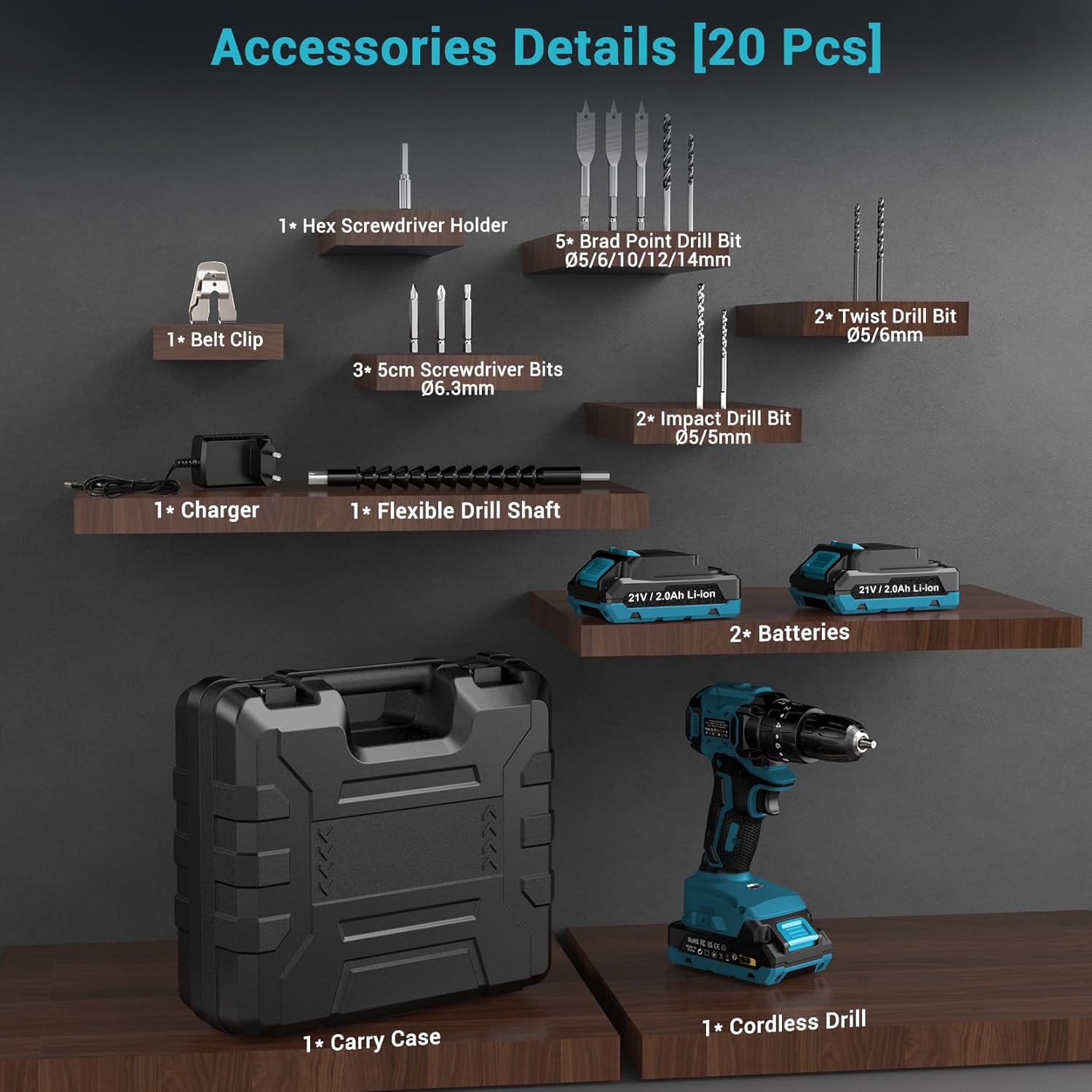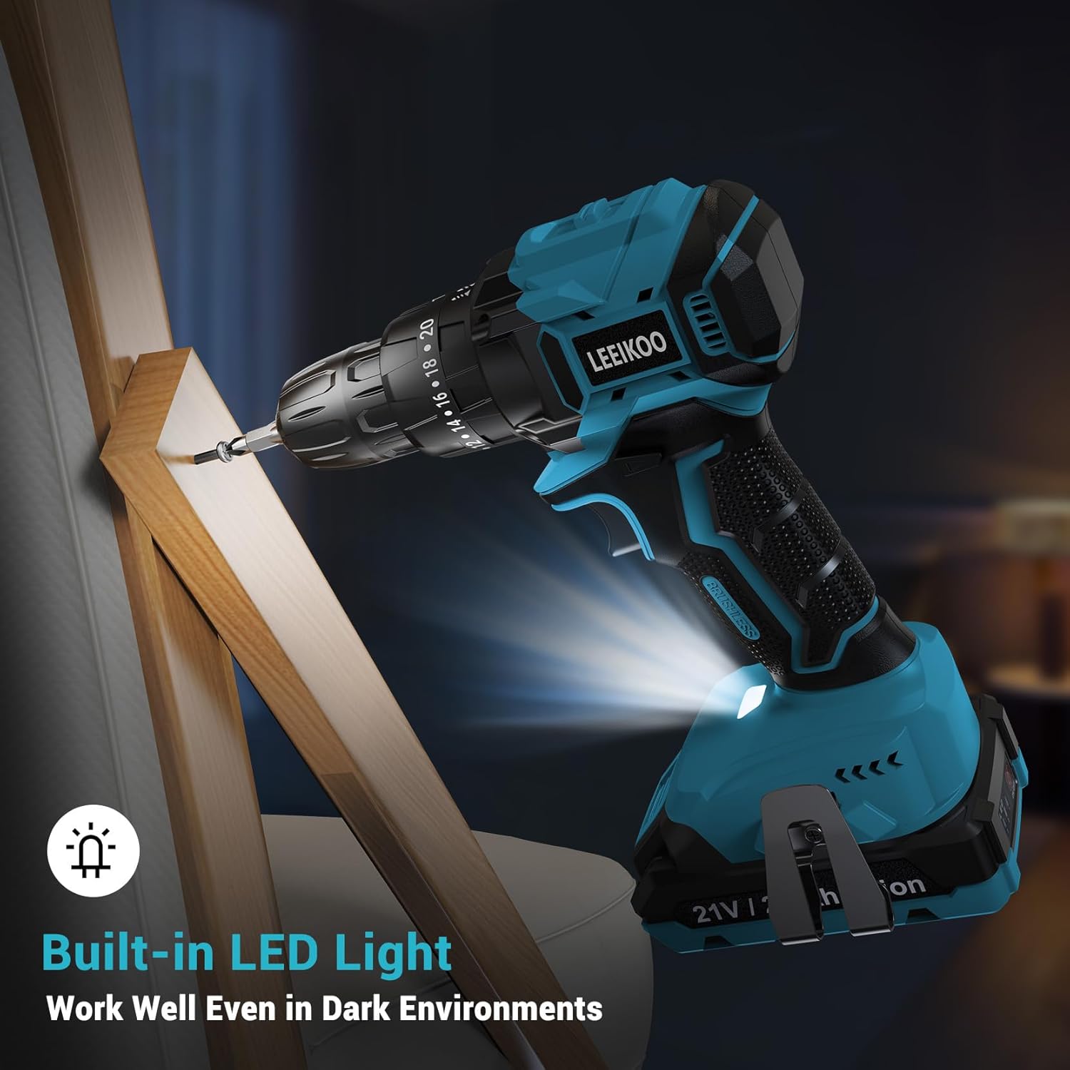 - Schnellwechsel-Spanngreifer & 10-teiliges Bohrzubehör: Mit 10 mm (3/8") Automatik-Spanngreifer wechseln Sie Bits in Sekunden. Das eingebautes LED-Licht erhellt Ihre Arbeit im Dunkeln. Unser Akkuschrauber-Set enthält:1x Akkubohrschrauber, 2x 2,0 Ah