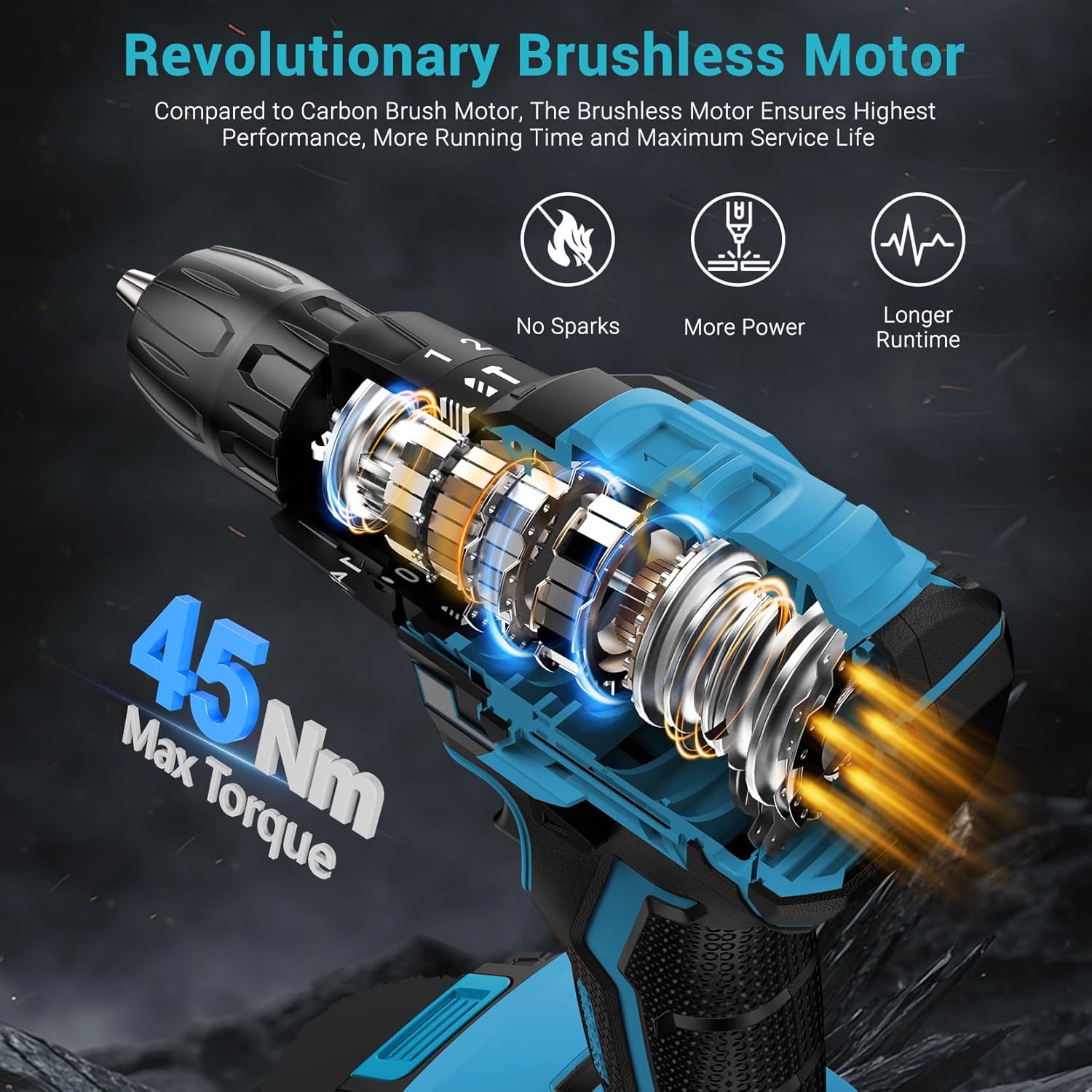 - Bürstenlose Leistungs-Motortechnik: Unser bürstenloser Akkuschrauber mit hocheffizientem Motor übertrifft herkömmliche Modelle: verbesserte Haltbarkeit, höhere Belastbarkeit, verlängerte Lebensdauer und kompaktes Design. Ohne Funkenbildung