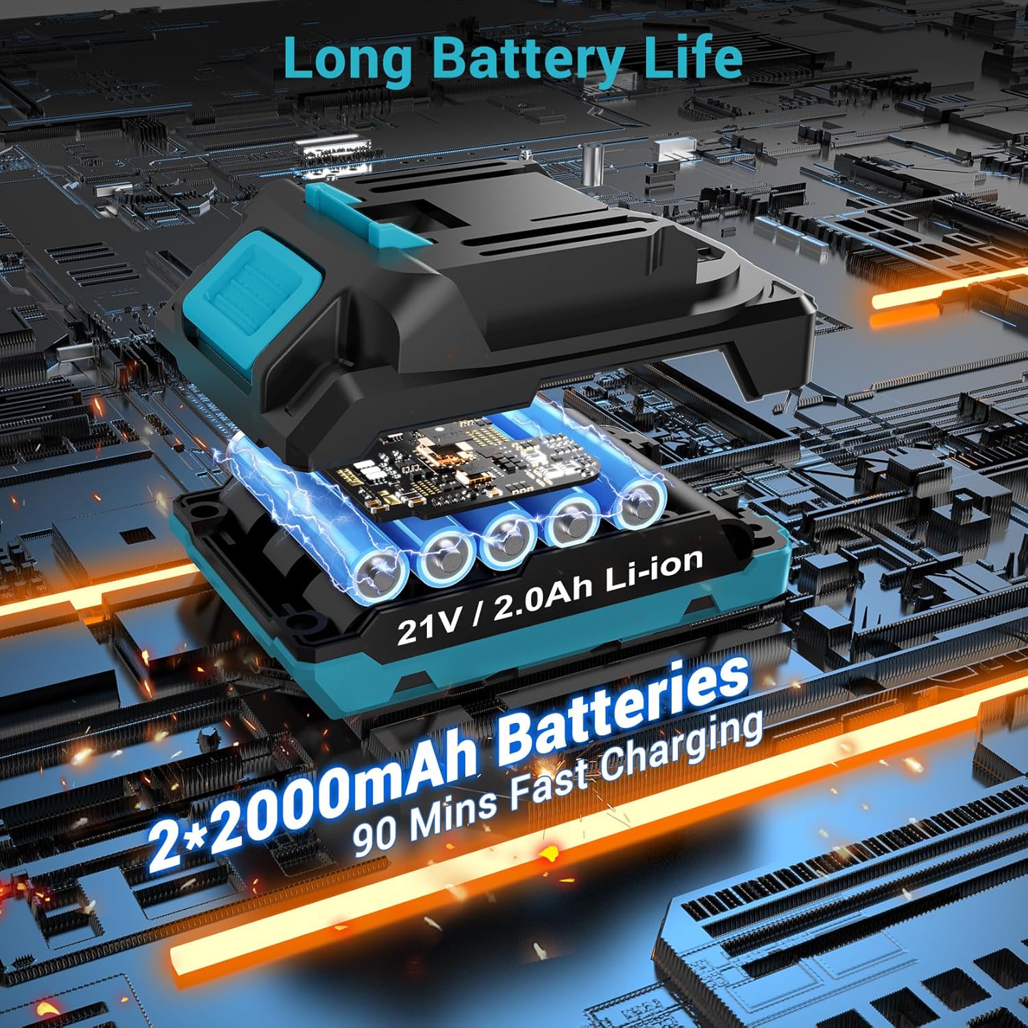 - 2×2,0Ah langlebige Akkus mit Ladeanzeige: Zwei leistungsstarke 2,0Ah Li-Ionen-Akkus sorgen für durchgängige Energie – kein Arbeitspause durch Ladeausfall. Schneller Akkuwechsel (90-min. Vollladung) und eingebaute Ladeanzeige garantieren