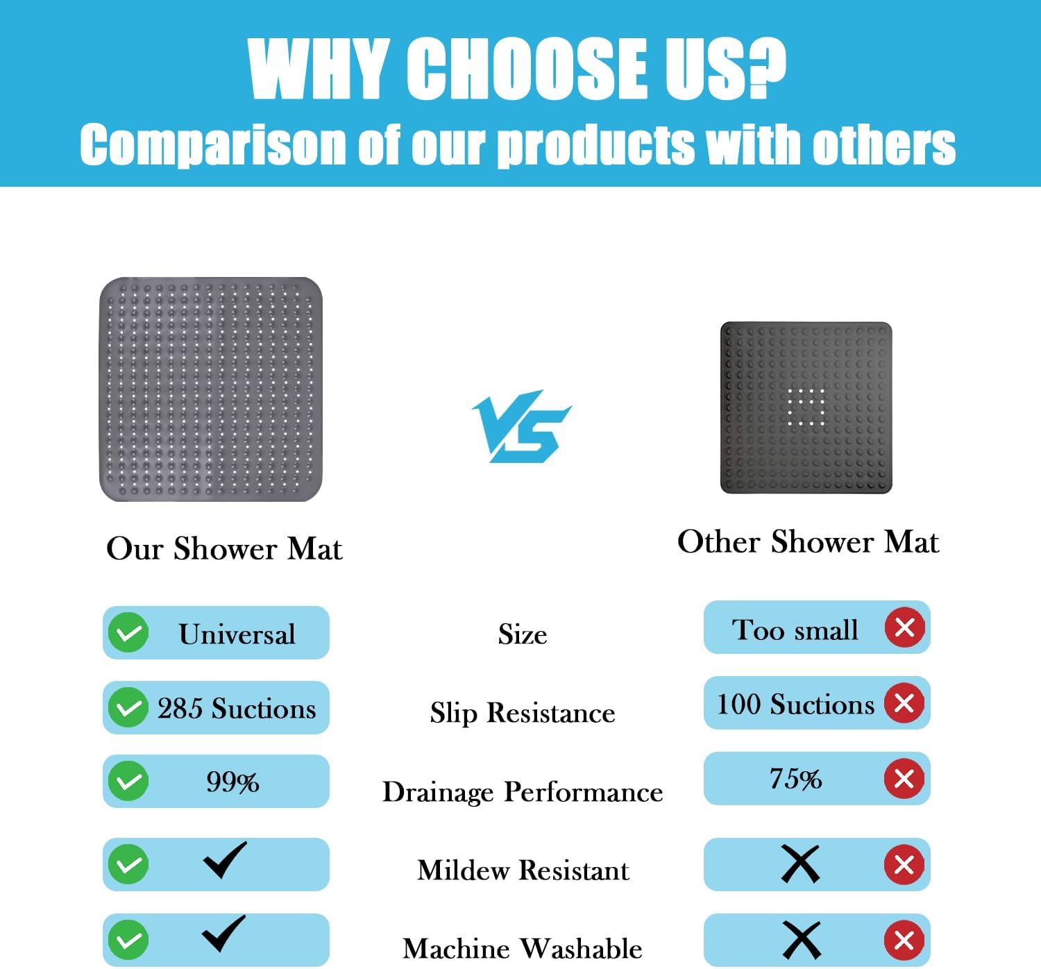 - đżăMultifunktionale NĂŒtzlichkeită Das abgerundete Design mit einer erhöhten kieselsteinĂ€hnlichen OberflĂ€che ermöglicht es Ihnen, die Dusche zu betreten, ohne auf den Fusssohlen auszurutschen, und 285 SaugnĂ€pfe auf der Unterseite fĂŒr eine