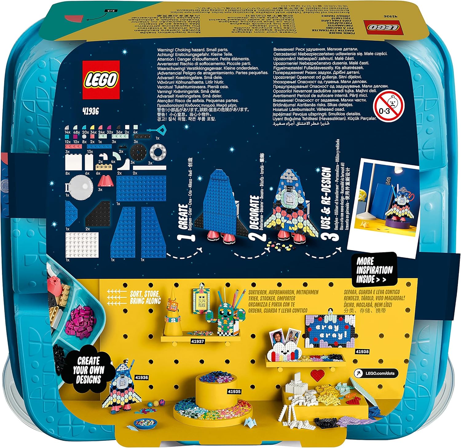 - Auf der Rückseite des LEGO DOTS Stiftehalters ist Platz für Stifte, ausserdem gibt es viele bunte Steinchen, um die Rakete passend zur eigenen Laune zu gestalten