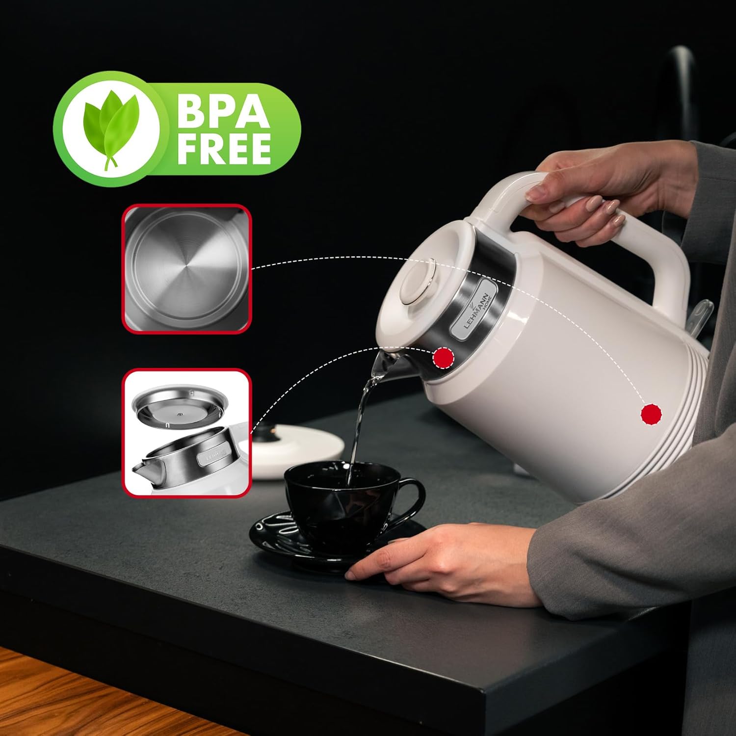 - Doppelwandige Thermoisolierung – hält das Wasser länger warm und verhindert gleichzeitig, dass sich Gehäuse, Griff und Basis erhitzen.