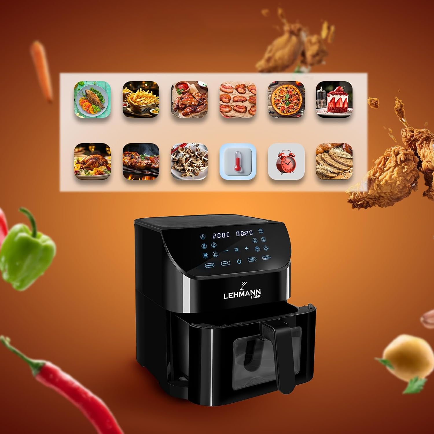 LEHMANN Heissluftfritteuse 8L, Airfryer mit Sichtfenster, Trenneinsatz für 2 Kammern, 12 Programmen,