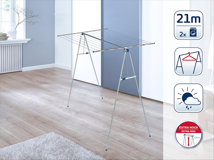 - Viel Platz - Auf insgesamt 21 m Wäscheleine können an diesem Leifheit Wäscheständer mehr als zwei Waschmaschinenladungen und auch lange Wäsche aufgehängt werden