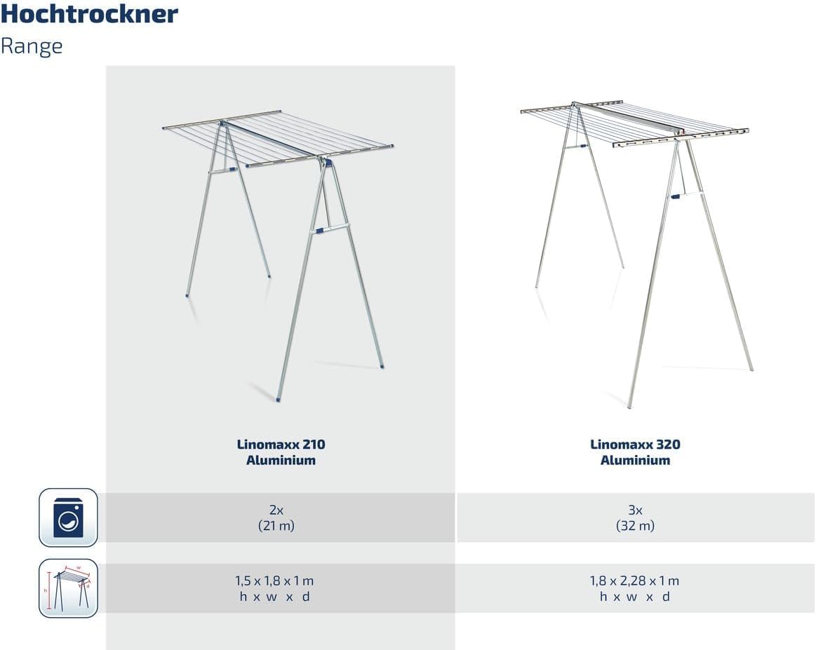 - Praktischer Lieferumfang - Leifheit Hochtrockner Linomaxx 210 mit 21 m Wäscheleine, Wäschehänger-Höhe: 150 cm, Masse des Leinenaufsatzes: 150 cm x 100 cm, Artikelnummer 72706