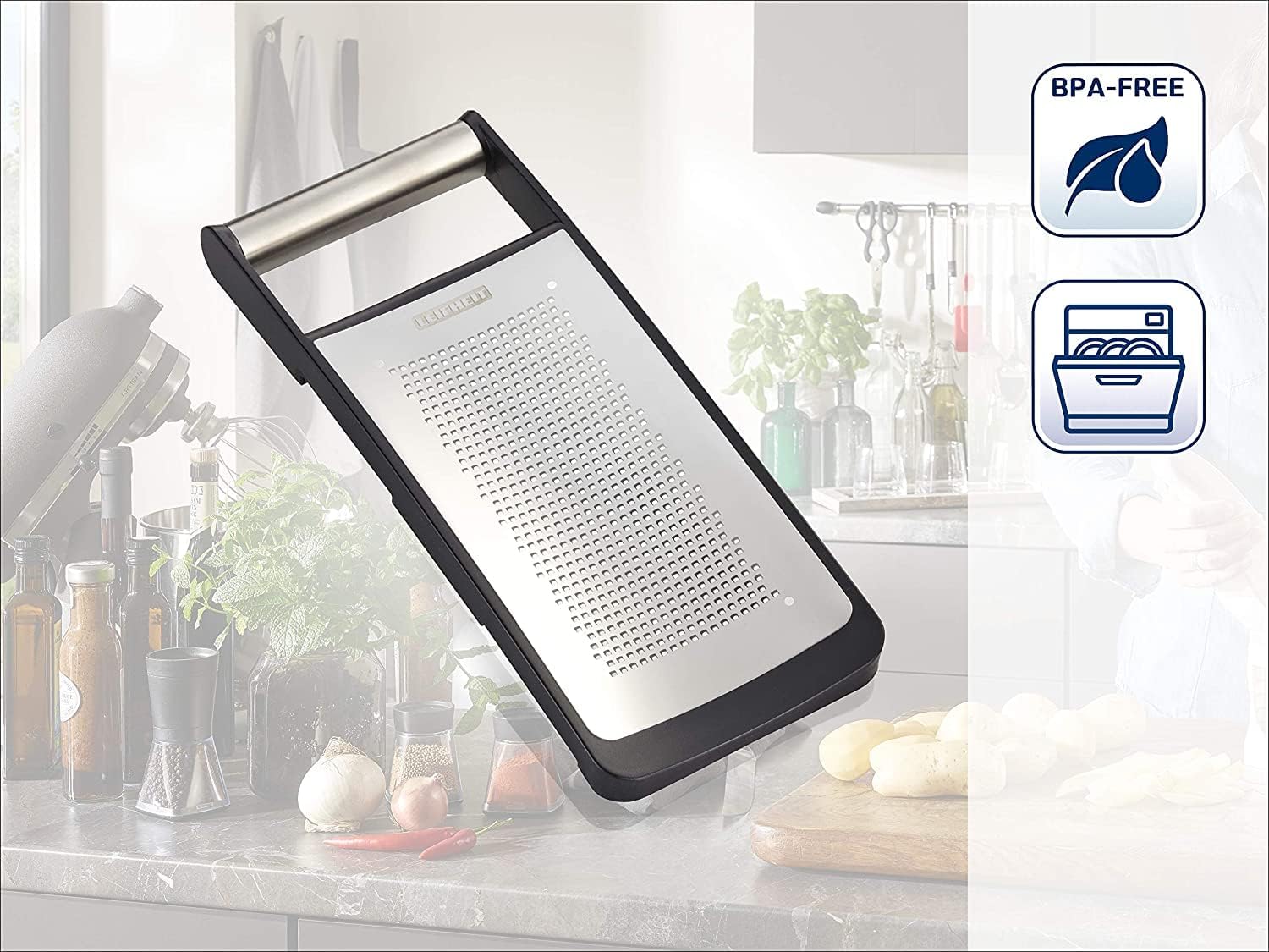 - Lieferumfang - Leifheit Microcut Gemüsereibe fein, mit extra scharfen Klingen, spülmaschinengeeignet, Art. Nr. 3014