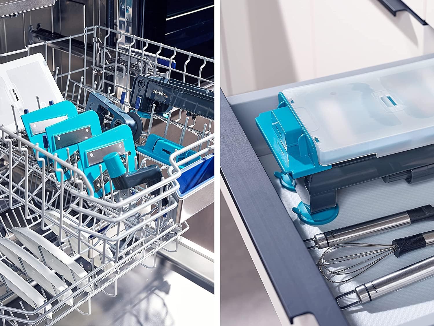 - Einfache Reinigung - nach dem Einsatz kann der Slicer einfach auseinandergenommen und unter fliessendem Wasser per Hand oder mühelos in der Spülmaschine gereinigt werden