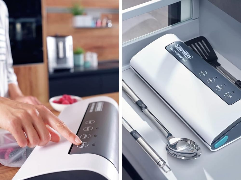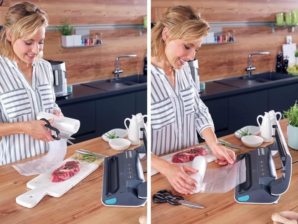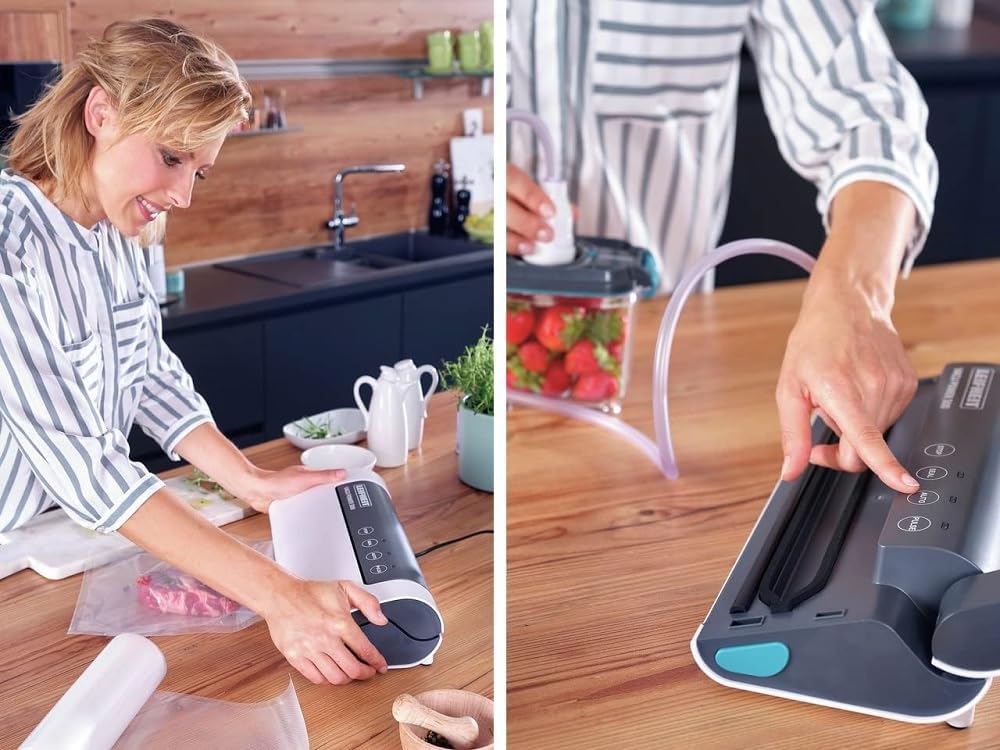 - Versiegelungsfunktion - die zusätzliche Funktion bietet die Möglichkeit Vakuum-Behälter zu vakuumieren. Die Vakuum-Dosen sind im 3er-Set, inklusive dem dafür nötigen Schlauch, separat erhältlich