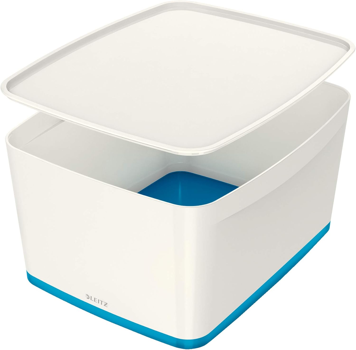 - Lieferumfang: 1x Leitz MyBox Aufbewahrungsbox mit Deckel, Gross, Blickdicht, Weiss/Blau Metallic, Kunststoff (ohne BPA), Abmessungen (LxBxH): 38,5 x 31,8 x 19,8 cm, Inhalt: 18 Liter, 1,38 kg, 52161036