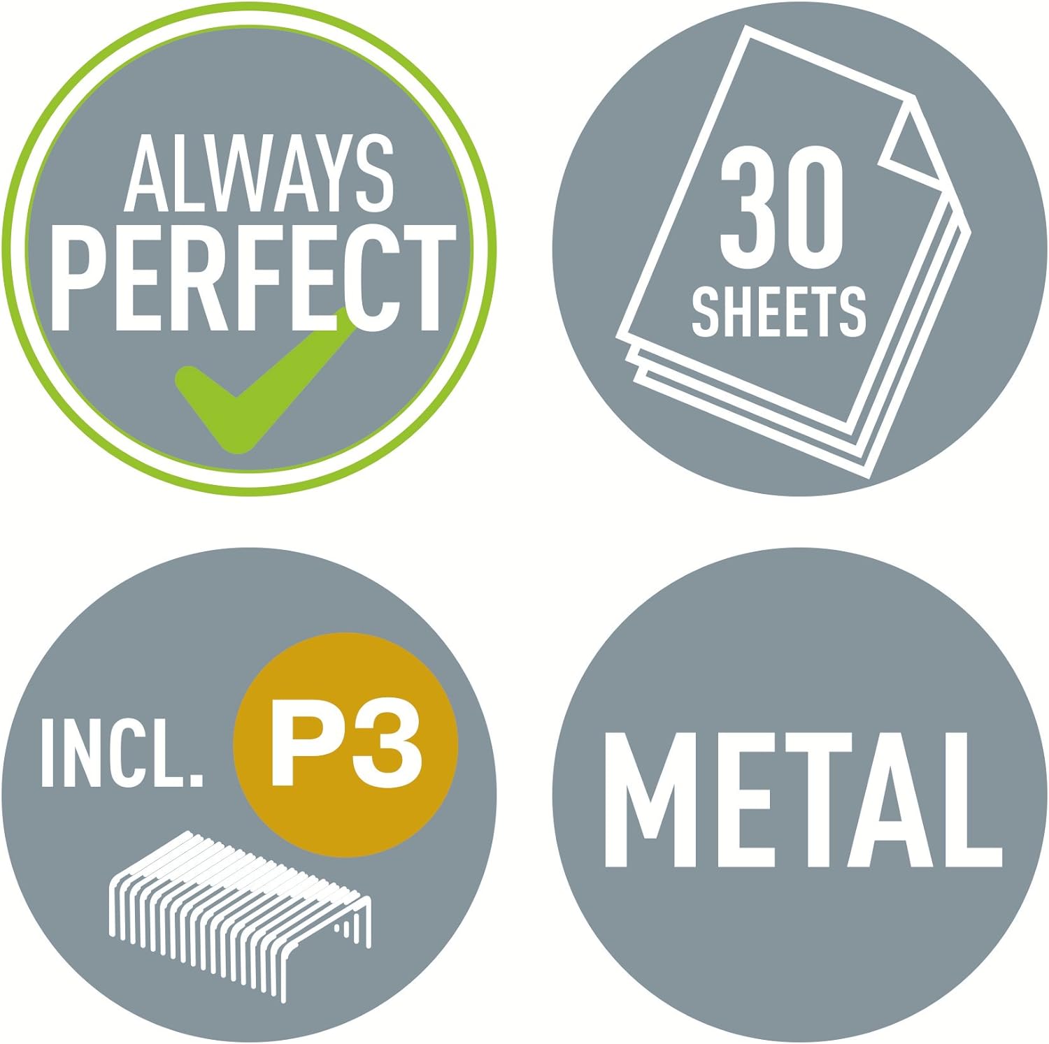 • Heftgerät für bis zu 30 Blatt mit integriertem Entklammerer, 200 P3 24/6 Heftklammern im Lieferumfang enthalten, Aufklappbar, Praktische Nagelfunktion dank 180 Grad Öffnung