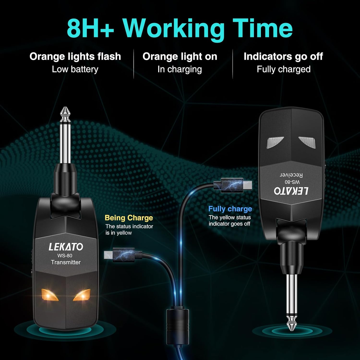 - 🎸8 Stunden Arbeitszeit: LEKATO WS80 Gitarren-Sender-Empfänger mit eingebauter wiederaufladbarer Lithiumbatterie. Die Arbeitszeit von bis zu 8 Stunden nach dem vollständigen Aufladen wird mit einem USB-Kabel mit zwei Enden geliefert. Lange