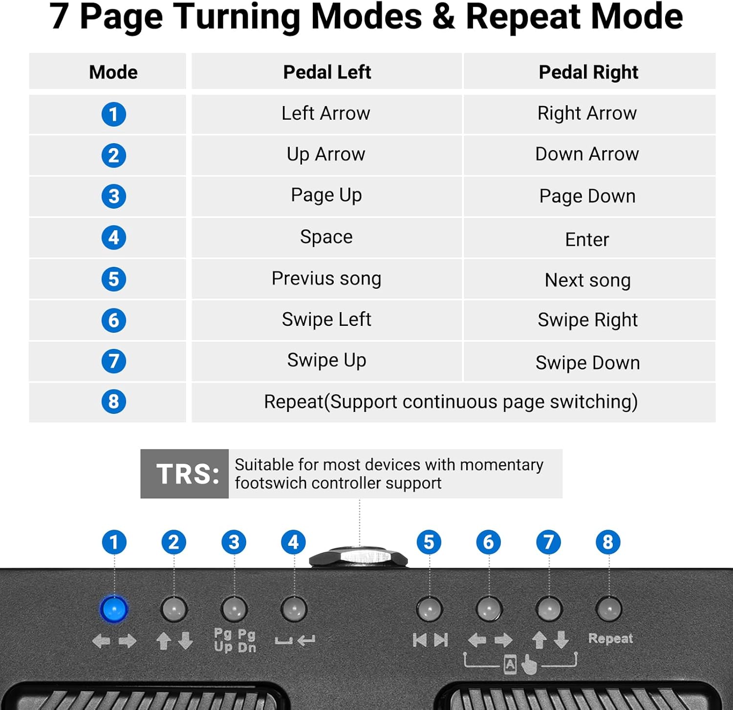 - Sieben Modi Zum Umblättern & Wiederholungsbutton: Seite nach oben & unten, Pfeil links und rechts, Pfeil nach oben & unten, linker und rechter Mausbutton, Leertaste und Eingabetaste, nach links und rechts streichen, nach oben und unten streichen, Lieder