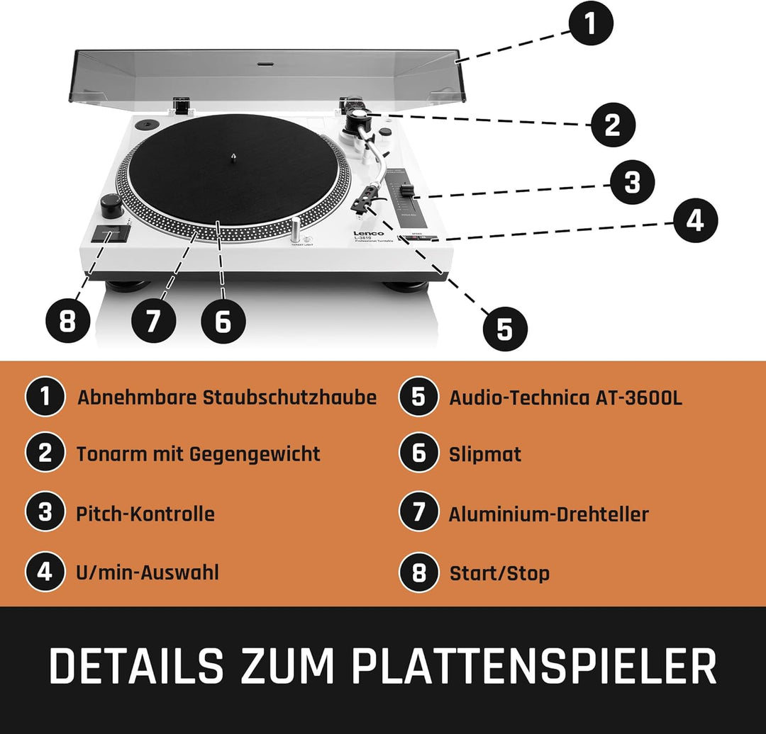 - DJ Plattenspieler: Der Lenco L-3810 ist nicht nur ein aussergewöhnlicher DJ-Plattenspieler sondern auch eine verlässlicher Plattenspieler für zuhause. Der L-3810 kann einfach in bestehende Hi-Fi Systeme eingegliedert werden und kann durch seien USB