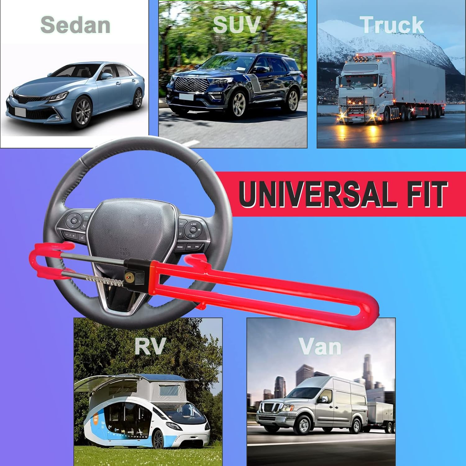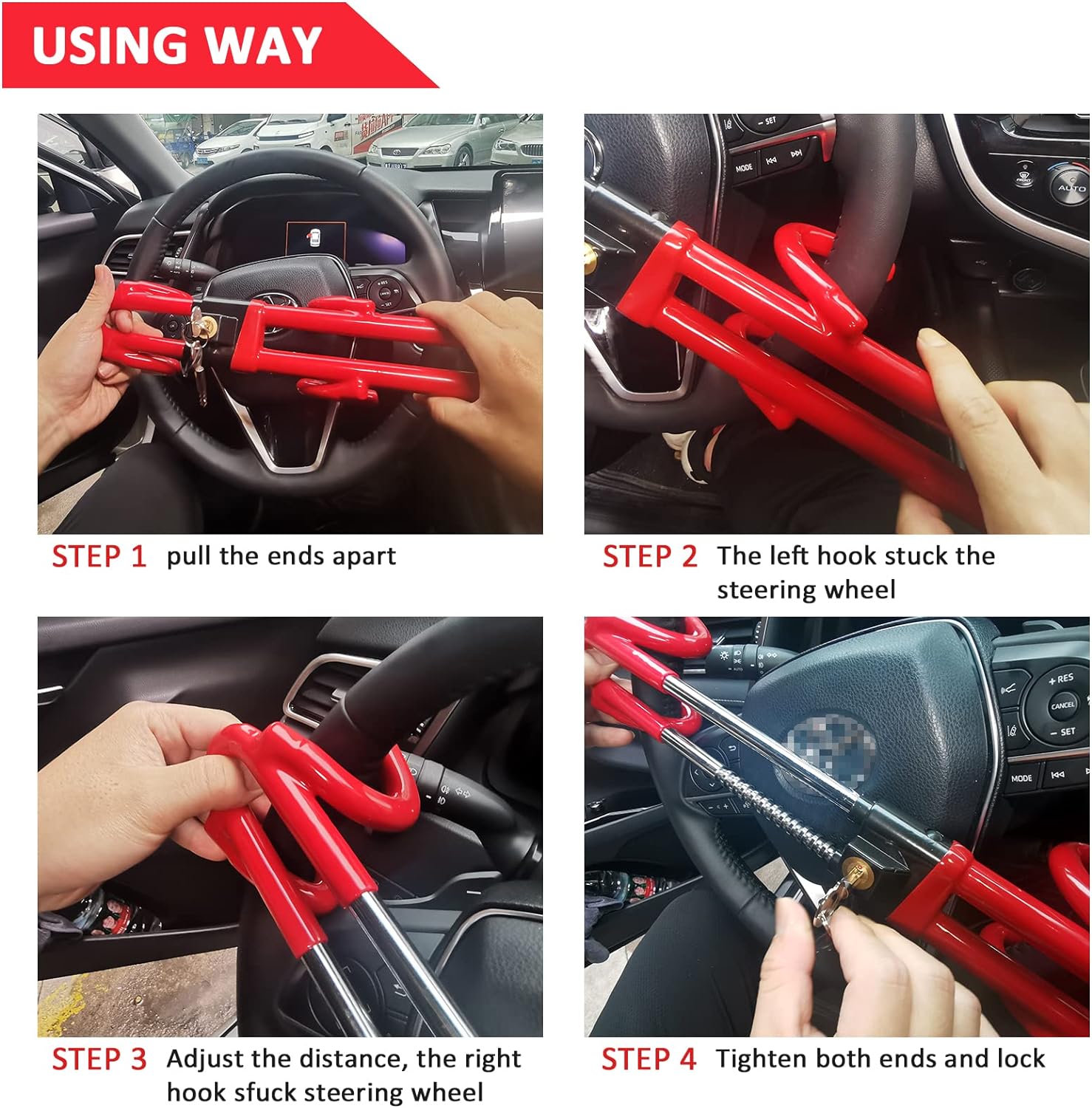 • 【Anwendbare Szenarien】: Das Lenkradschloss eignet sich für jede Situation, die eine verbesserte Fahrzeugsicherheit erfordert, einschliesslich Parken am Strassenrand, Parkplätze, Wohngebiete, Gewerbegebiete und vieles mehr.