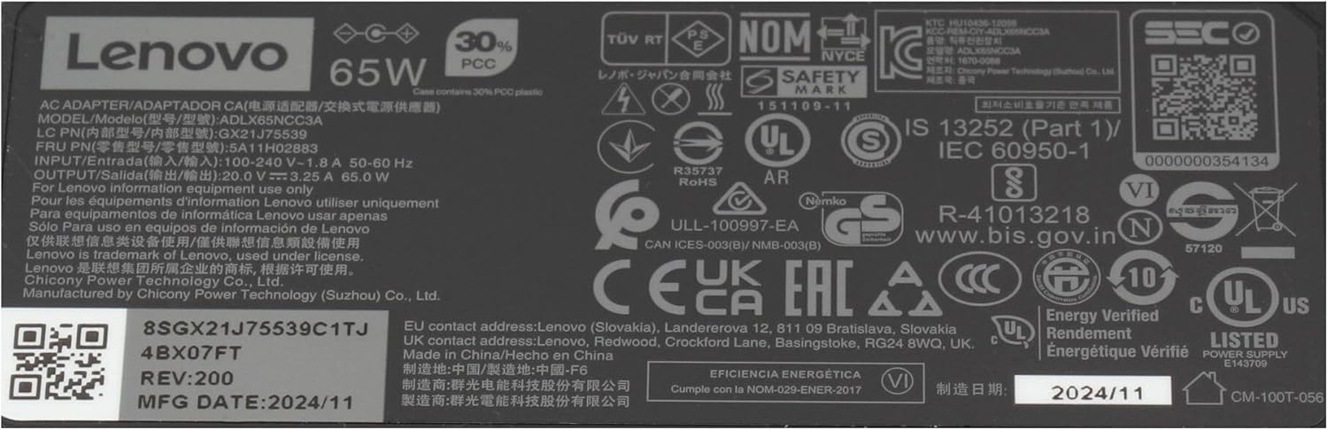 - Spannung: 20 Volt, Stomstärke: 3,25 Ampere, Ausgangsleistung: 65 Watt, Eingangsspannung: 100-240V / 50-60Hz, Energieeffizienz: VI