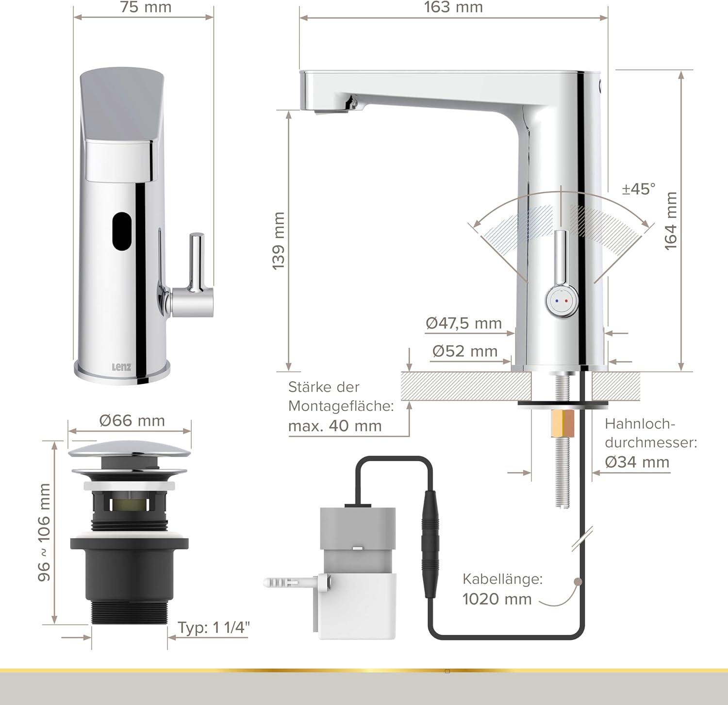 - schwenkbare Mischdüse zur besseren Kontrolle der Fliessrichtung des Wasserstrahls