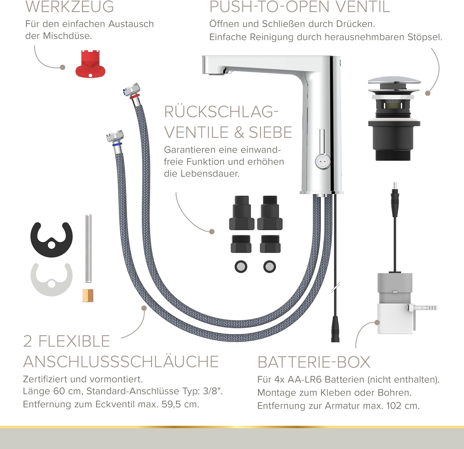 - zertifizierte flexible Markenanschlussschläuche erleichtern das Anschliessen an die Wasserversorgung
