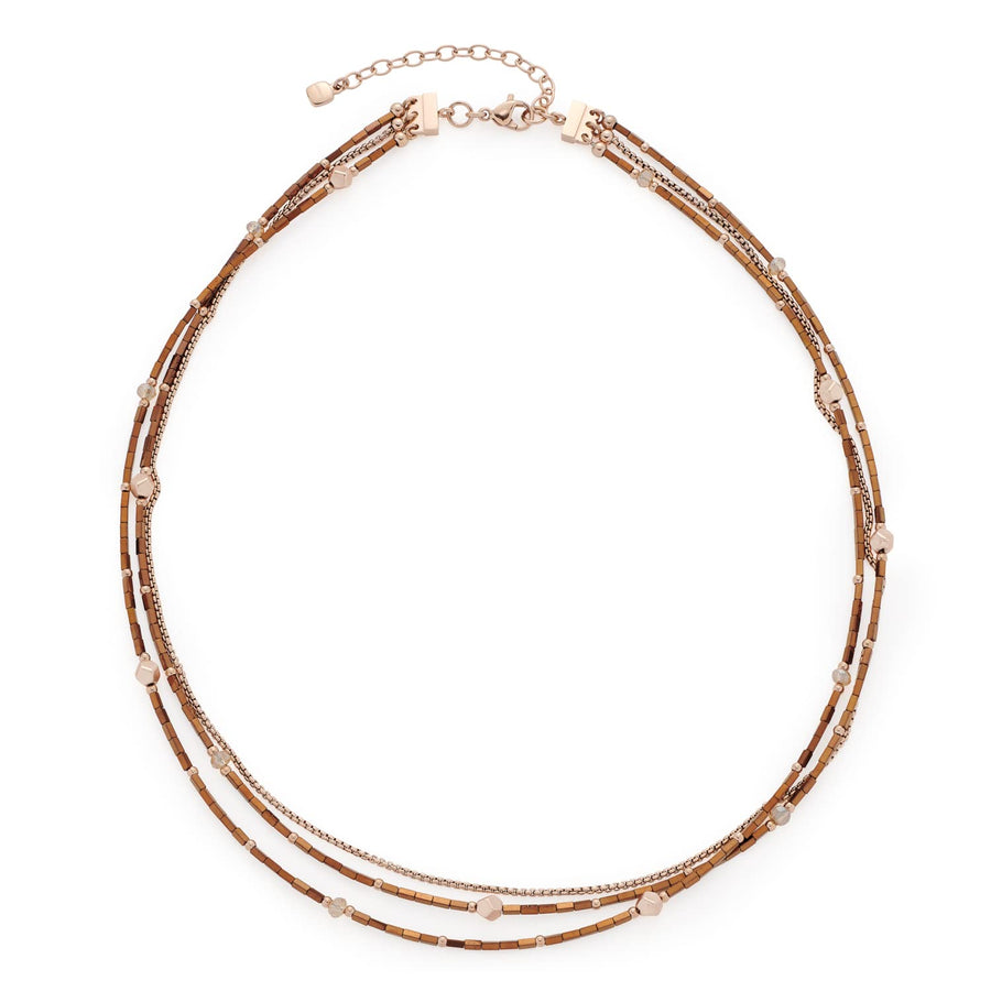 PRODUKTBESCHREIBUNGEN Unterschiedlich geformte Hämatitperlen, gelüsterte Glaskristalle im Design einer Perle und eine feine Venezianerkette aus roségoldenem Edelstahl verschmelzen zu einer exklusiven Einheit, die dieses Collier zu einem echten Schmuck-Highlight werden lässt.