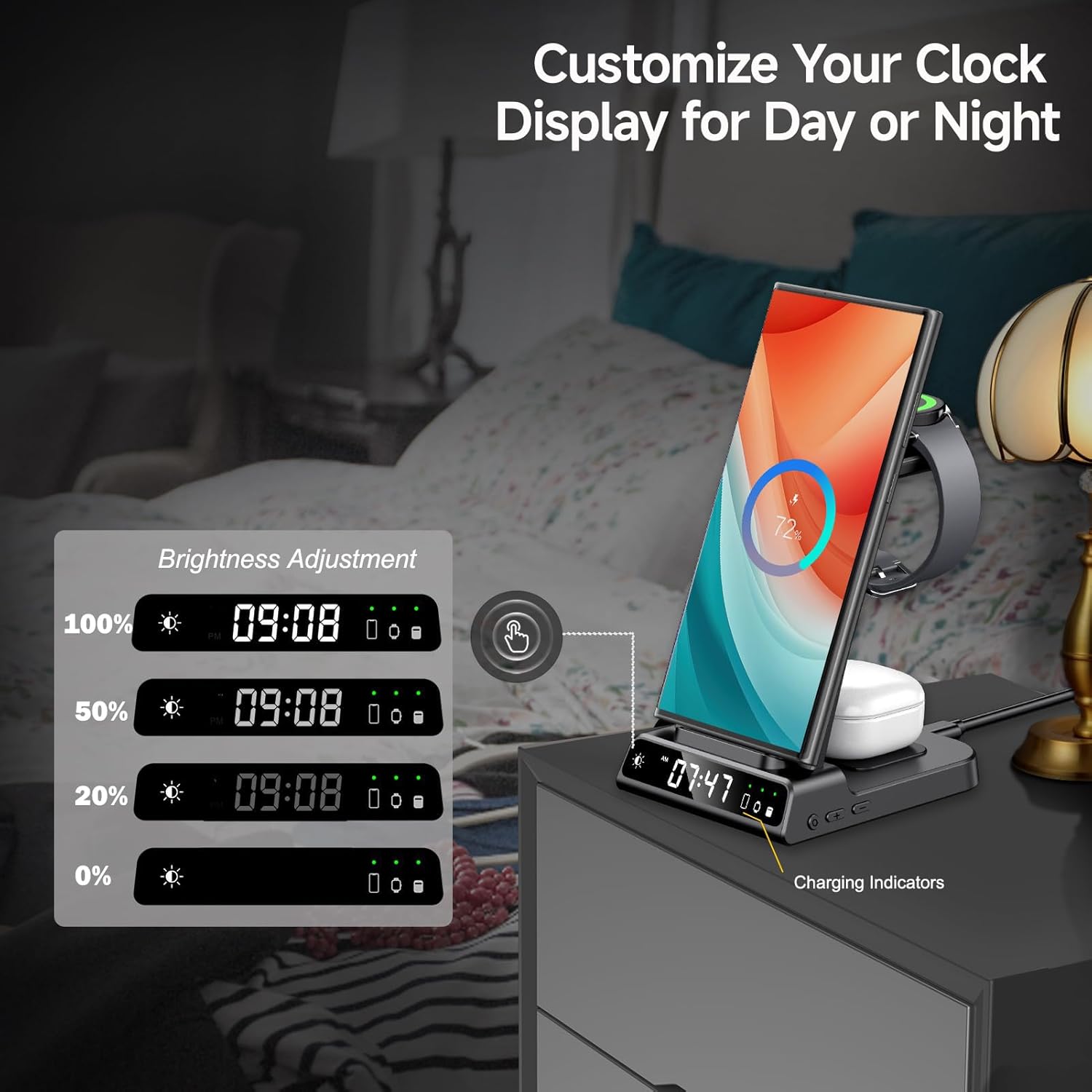 - ⚡【Digitaluhr und LED Anzeigedesign】Das einzigartige Design des kabellosen Ladegeräts ist mit einer Digitaluhr ausgestattet. Berühren Sie das Helligkeitssymbol, um die Helligkeit in drei Schritten anzupassen. Wenn es Ihnen nachts zu hell