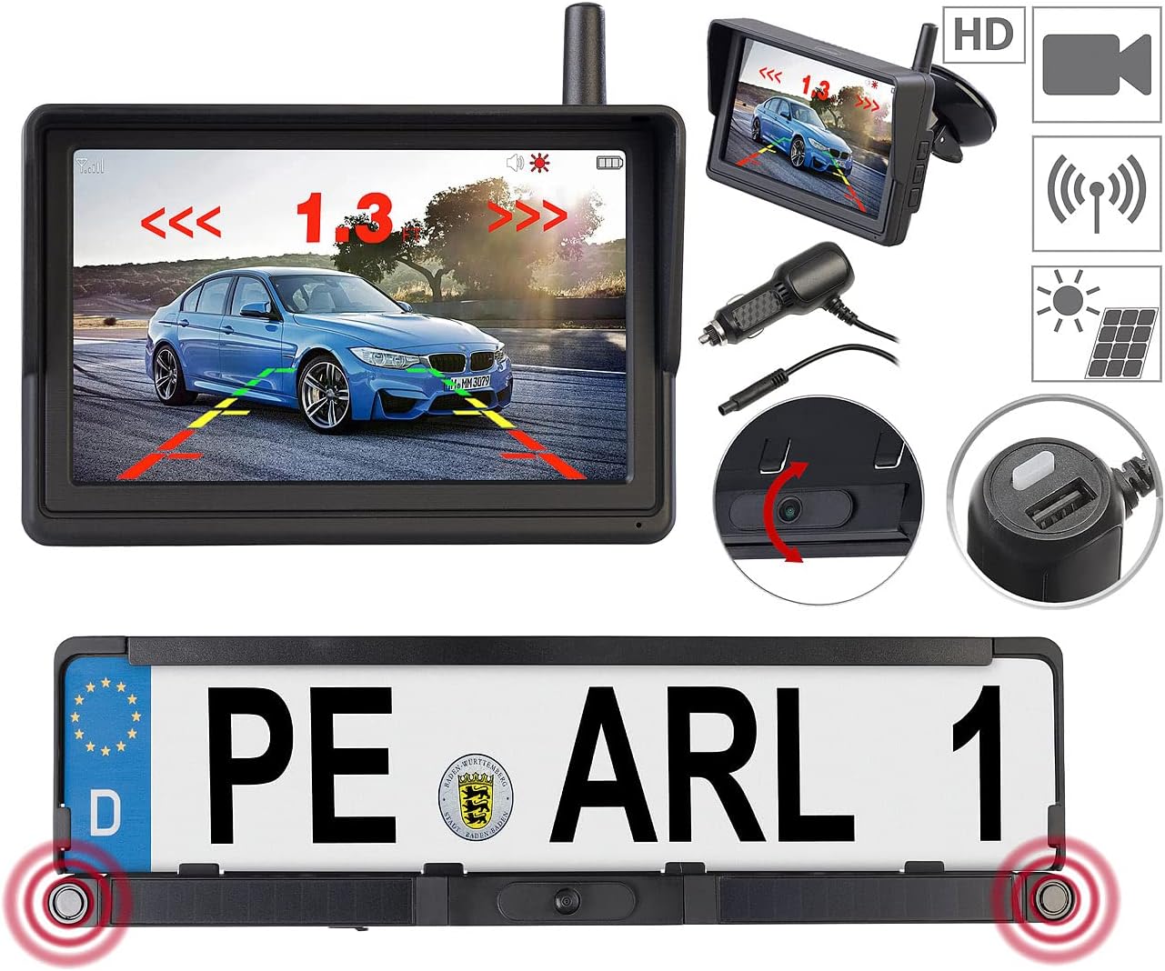 - Nummernschild-Halterung mit Kamera und Sensoren inklusive Monitor, Kfz-Netzteil, USB-Ladekabel (für Kameraakku), Monitor-Saugnapf-Halterung, Montagematerial und deutscher Anleitung. Rückfahrkamera Nummernschild Solar - Ausserdem relevant oder passend