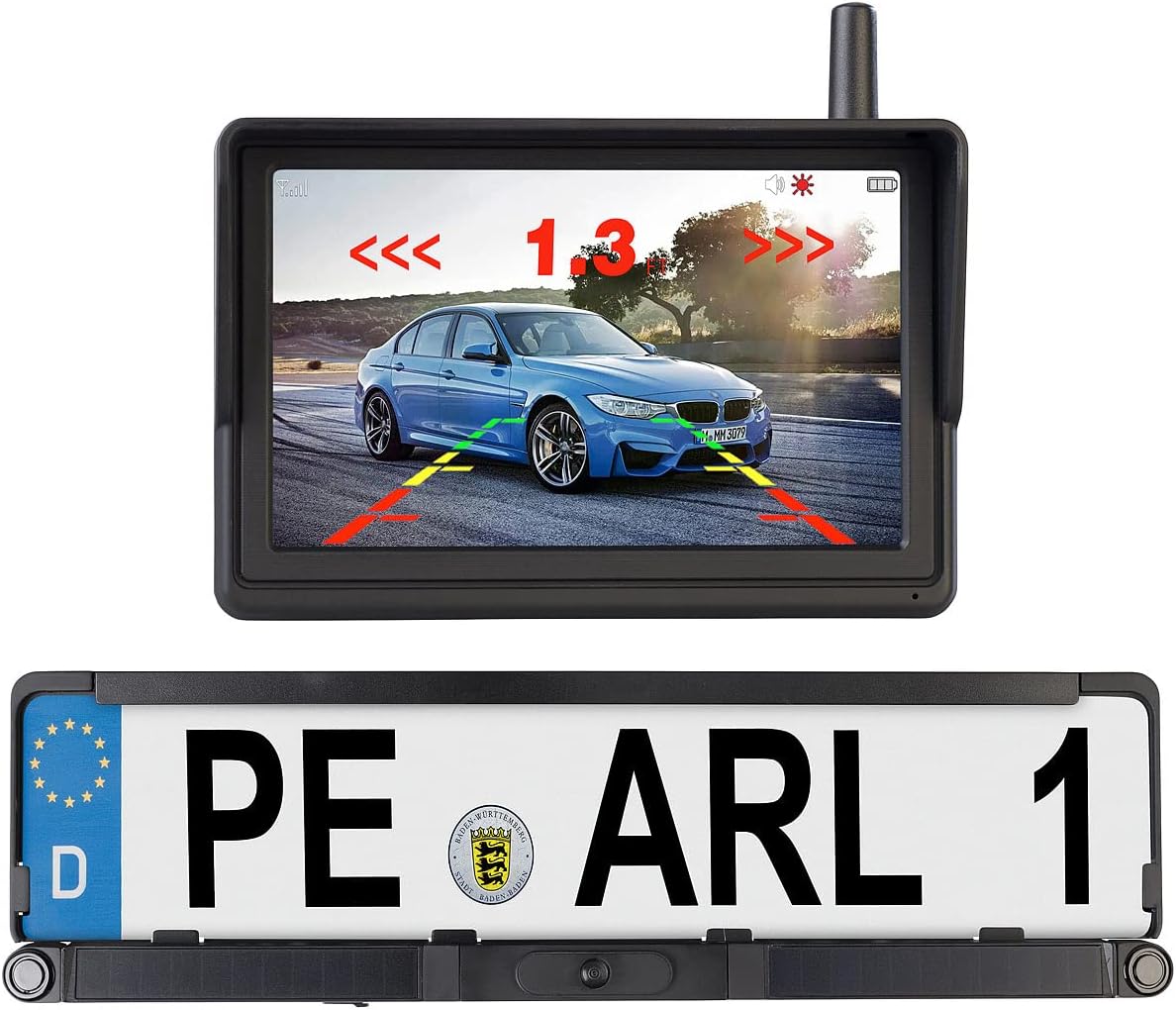 - Funk-Rückfahrhilfe PA-720.slr mit einstellbarer Kamera und Abstandssensoren in Nummernschild-Halterung • Farb-Monitor mit 12,7 cm / 5" Displaydiagonale: zeigt Kamerabild, Einpark-Hilfslinien und gibt akustische Abstands-Warnung • Halterung geeignet